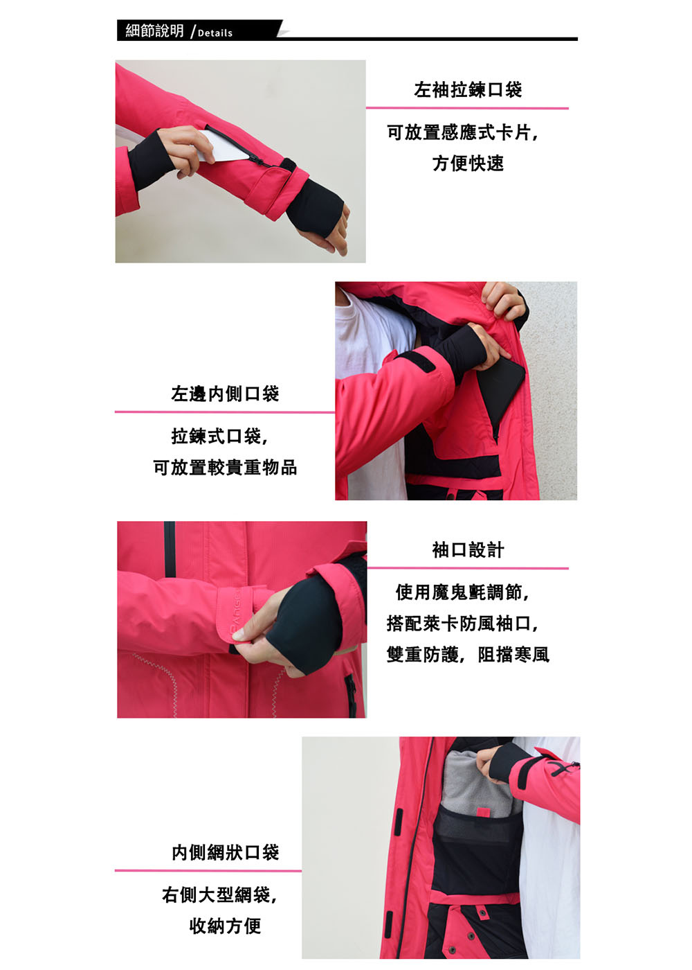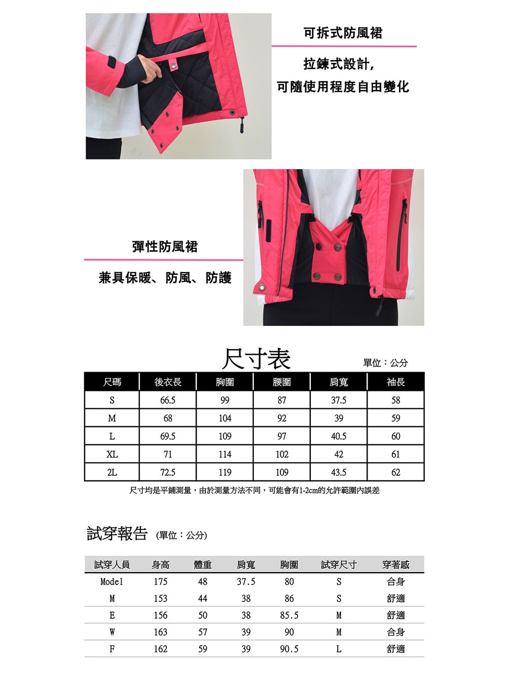 • 防風、防水、透濕、保暖。