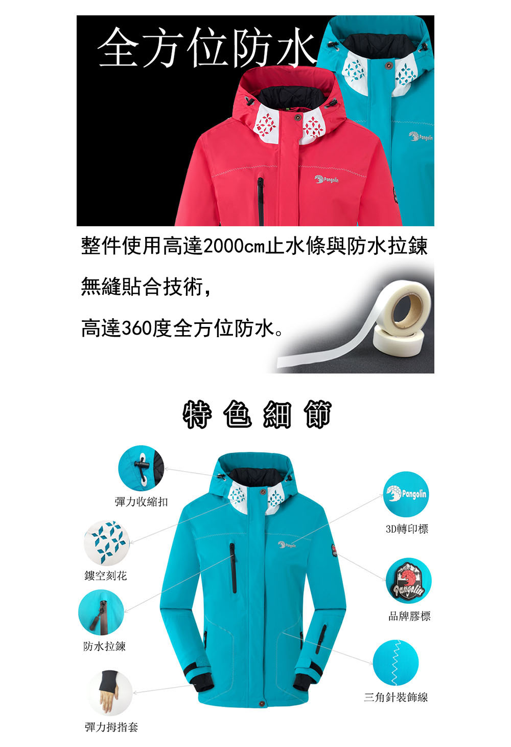2、卓越的防水透濕機能布料,加上接縫壓膠止水帶的工藝,可達到360度全面防水作用。
