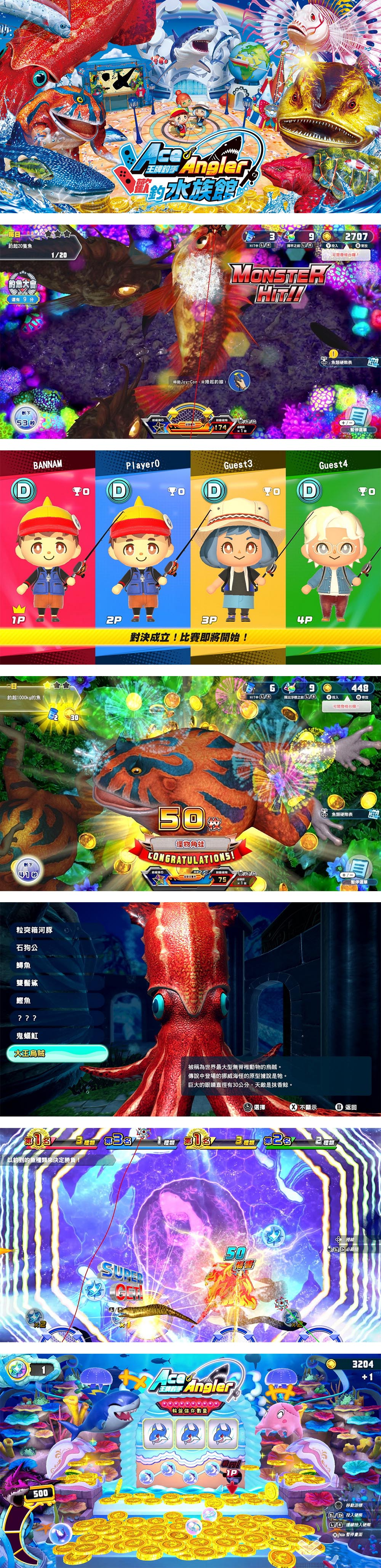 本次的《王牌釣手 歡釣水族館》,是擁有以鯊魚為象徵的水族館,以及 5 個遊樂設施的主題樂園「大豐收硬幣樂園」。玩家將可以在大豐收硬幣樂園的遊樂設施中,盡情釣魚玩樂並收集硬幣,並加入了全新關卡及大魚,最多可由 4 名玩家透過鄰近主機通訊或網路通訊方式一同遊玩。另有劇情模式、推硬幣遊戲、派對模式等各式各樣的模式,可以 1 人遊玩,更可與眾人盡享《王牌釣手》的釣魚樂趣。使用收集的硬幣獲得魚類,並加入水族館,以完成共 12 層樓的水族館為目標。
