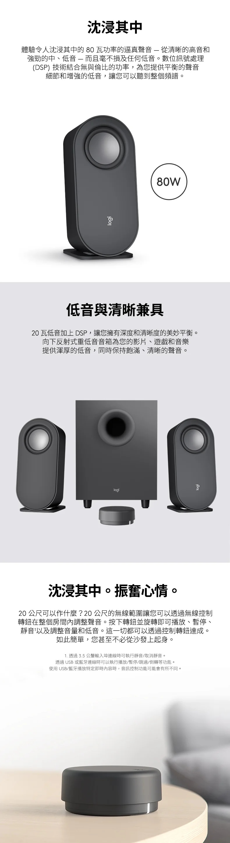 控制: 無線控制轉鈕上提供電源、音量、低音控制、靜音、取消靜音、曲目向前快轉、向後快轉、藍牙配對、音源切換按鈕等功能。