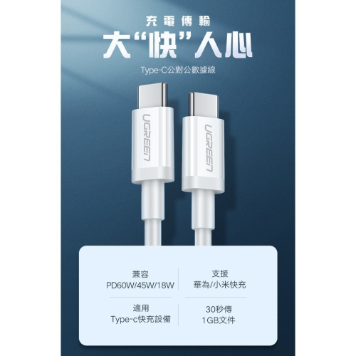 聯迅~來電更優惠 綠聯 Type-C 快充傳輸線 ABS版 White 白色 PD閃充 急速滿電 1M