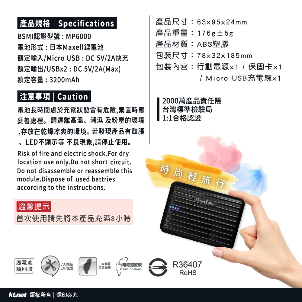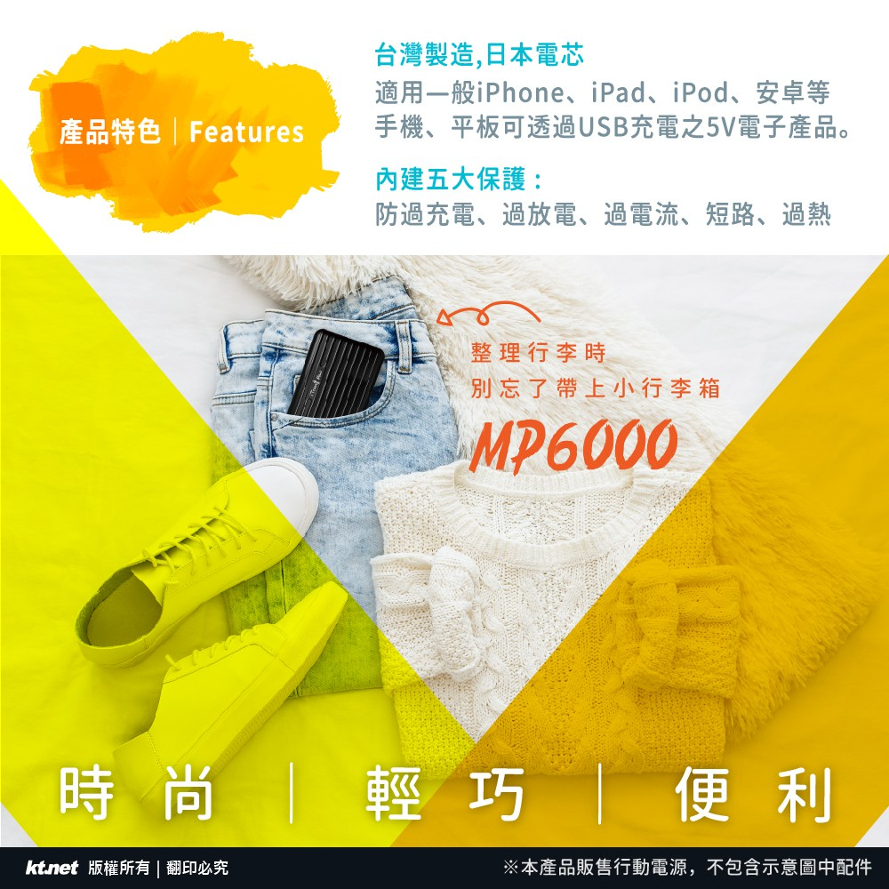 聯迅~來電更優惠 kt.net MP6000 旅行家2USB 快充行動電源 6000mAh / 台灣製造.日本電芯