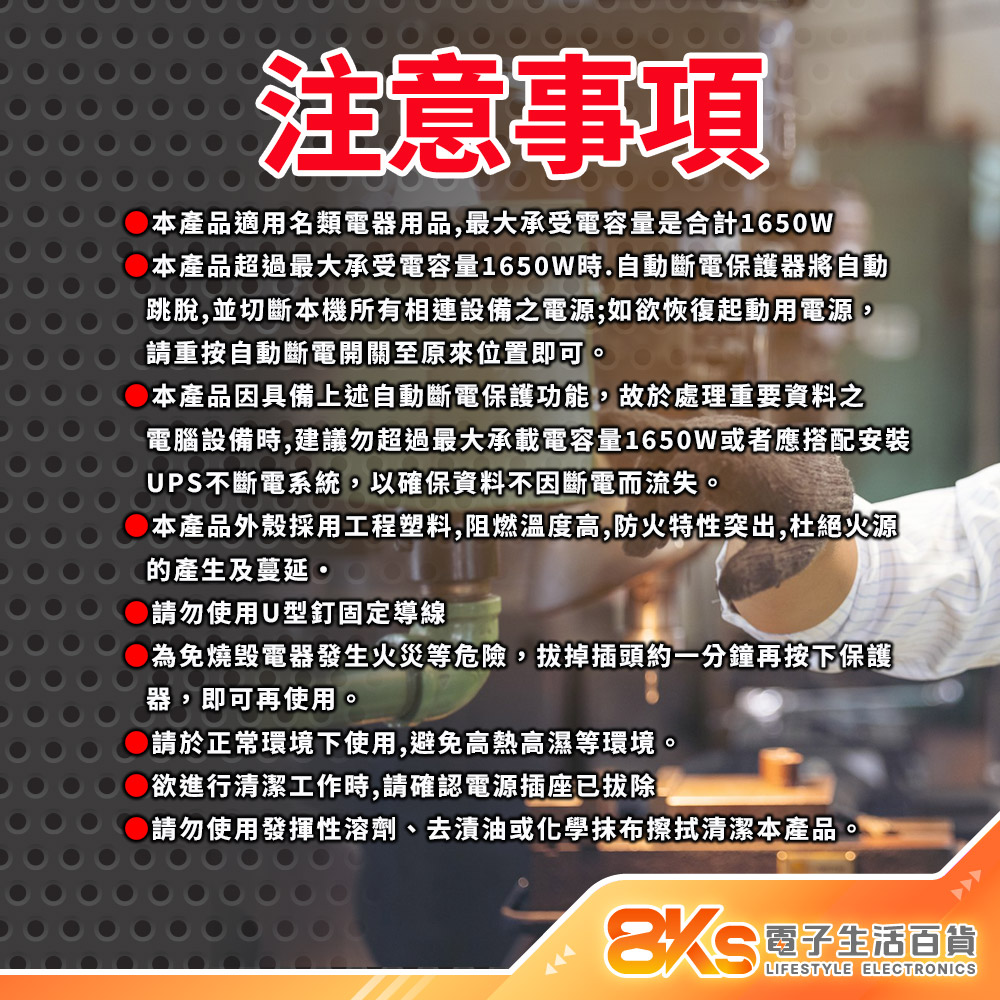 ●本產品超過最大承受電容量1650W時.自動斷電保護器將自動