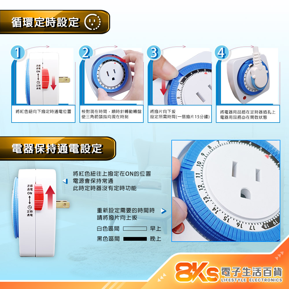 將撥片向下扳,設定所需要時間時段(一個撥片15分鐘)