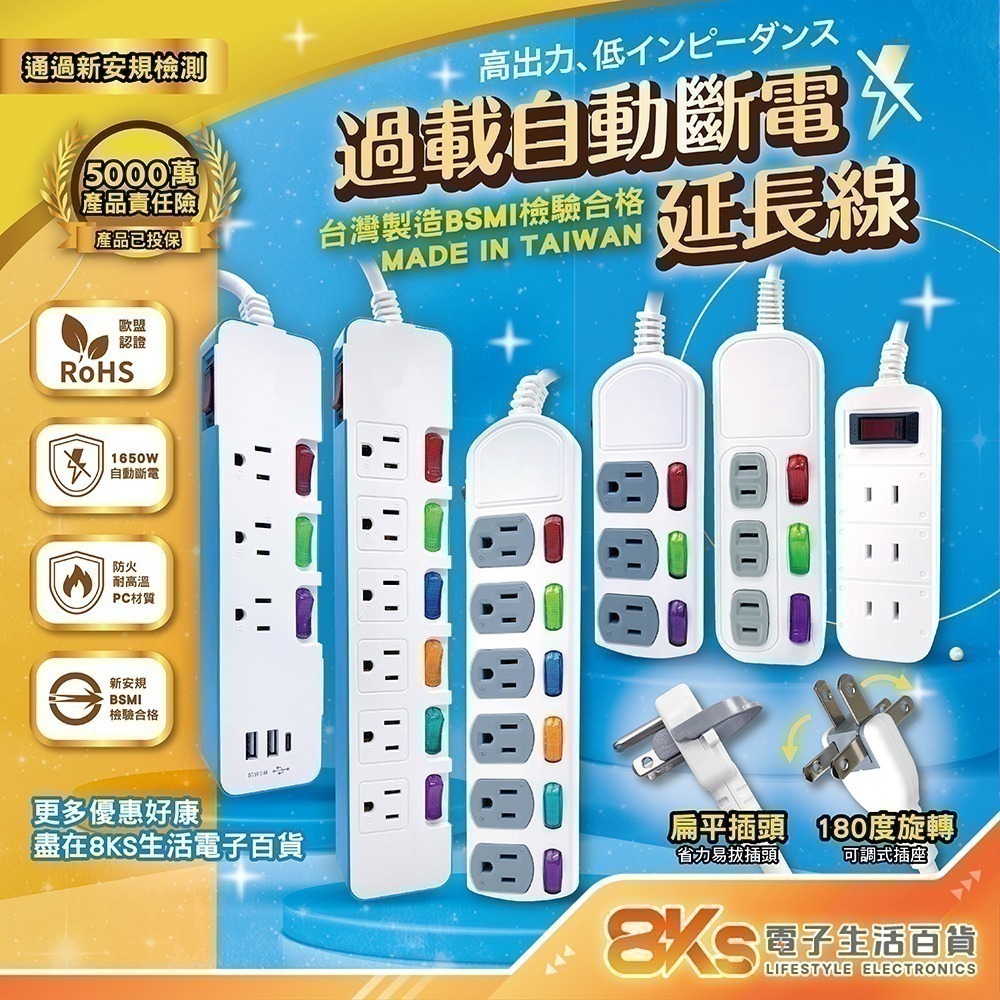 1.插座總數最大承受電容量1650W,請參考附表使用。超過會自動斷電,自動保護器將自動跳脫,並切斷所有相連電源,如需恢復啟動電源,拔掉所有插頭後,約一分鐘再重新按下自動斷電開關至原本位置,即可使用。
