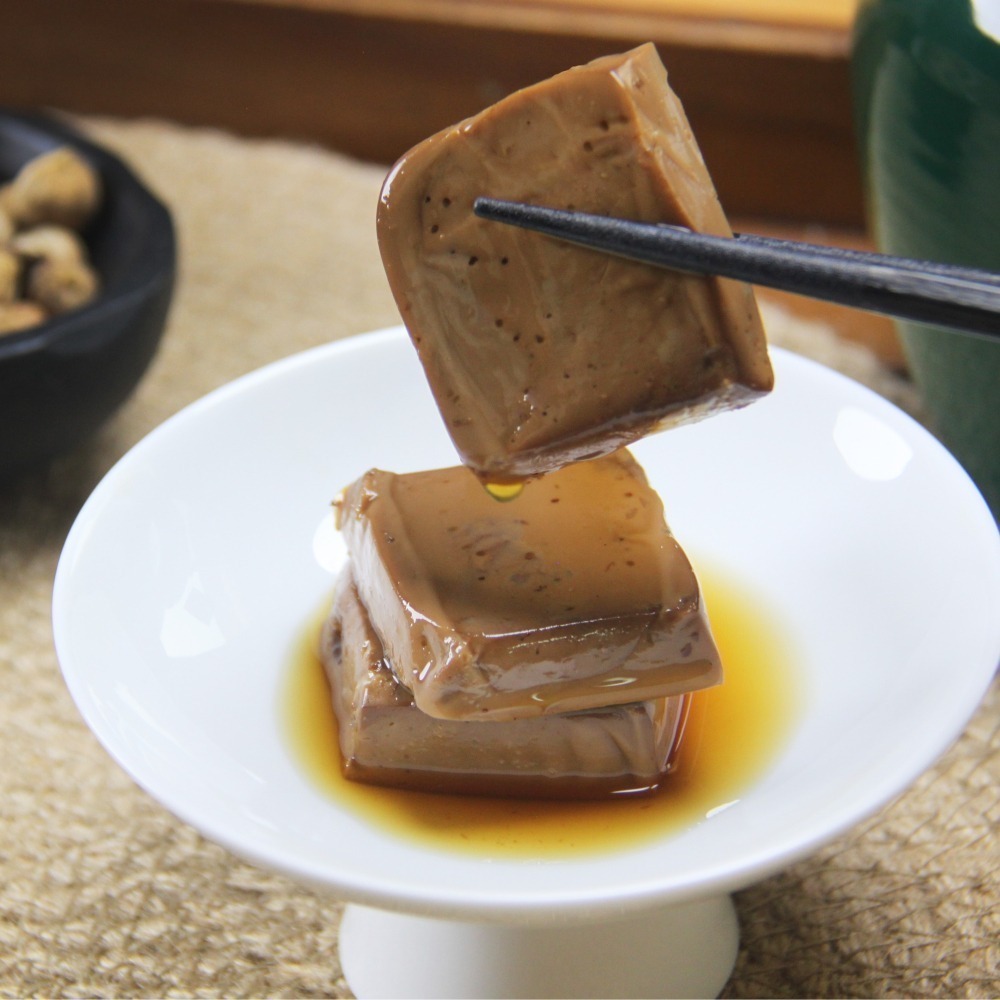 由蛋白經蒸煮後冷卻成型,切成一塊一塊,形似豆干,口感卻大不相同,滑嫩Q彈,新奇又好吃。