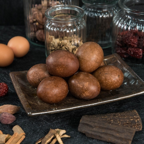 選用頂級香料一起燉煮,加入特殊比例的「黃耆」與「黑棗」, 顏色赤如紅鑽,美稱為「可以喝的茶葉蛋」,