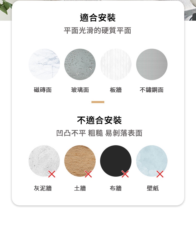 1.本產品只能安裝在光滑無縫的表面,例如玻璃,光滑金屬平面.