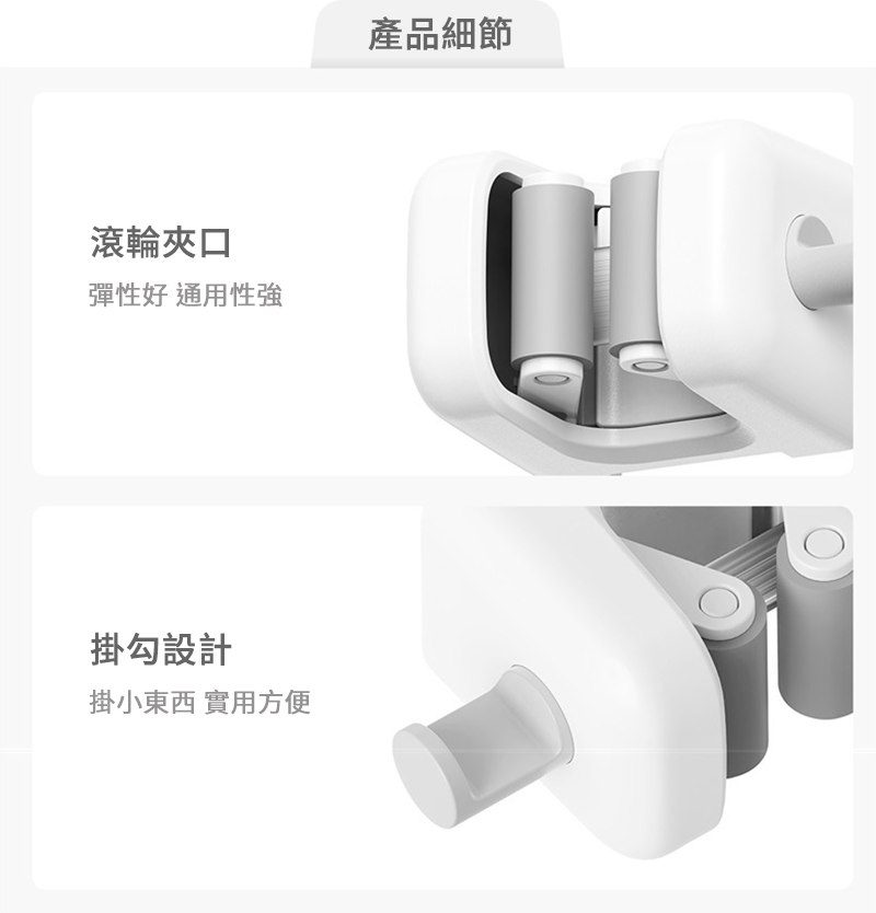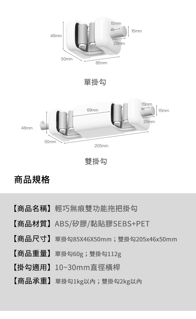 1.本款整合了掛勾功能與矽膠滾輪拖把掛勾功能於一身,並有單一掛勾與雙掛勾選項供選擇,完整提供了類似產品的功能。