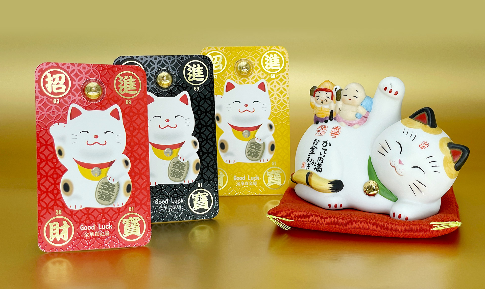 9999純金小金豆,精心裝在可愛的招財貓圖案檢驗卡內,象徵招財進寶、好運連連。