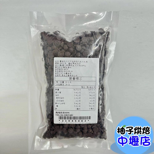 【柚子烘焙材料-中壢店】 品名:買挺您代可可脂苦甜巧克力水滴 規格:200公克 產地:馬來西亞 成分:糖,氫化棕櫚核油,可可粉(16%), 葵花籽卵磷脂,香料 保存期限:360天 保存方式:冷藏保存 ======下單貼心提醒====== 📦 包裹規格限制: ◆下單後若商品無缺貨1~3天內會出貨。(除特殊情況除外喔~) ◆超商取貨及蝦皮店到店限重五公斤以內(含包裝材料)。 提醒您若購買1公斤的商品,超取蝦取最多只能購買四包喔! ◆黑貓宅急便 重量限制20公斤以內~ ◆花東,外島及偏遠地區 運費另計, 下單需另外下標「運費補差額」 ◆如遇夏季氣溫較高,建議巧克力及堅果類商品以「低溫宅配」方式配送。 若選擇超商.店到店等常溫配送造成巧克力融化,無法提供更換或退費服務。 👉開箱貨品時請錄影,有任何問題可以確保雙方權益!!!!👈 🔊因實體店面和蝦皮同步販售,有時會有店面已售完,但蝦皮還有庫存的情形,若有急用歡迎聊聊詢問哦! 🔊任何問題歡迎 "聊聊詢問小編喔" ◆實體店面:柚子烘焙材料-中壢店 地址:桃園市中壢區延平路448號1樓 電話:03-4255030