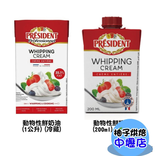 【柚子烘焙材料】法國總統牌 動物性鮮奶油35.1% 1L/200ml(冷藏) President總統 鮮乳脂奶油 1公升