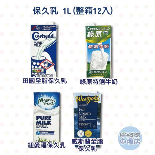【柚子烘焙材料】保久乳 整箱購 田園全脂牛奶 綠原特選牛奶 紐麥福保久乳 威斯蘭保久乳 綠原保久乳 1L*12瓶/1箱