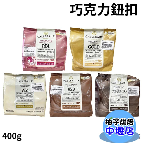 【柚子烘焙材料】嘉麗寶 巧克力鈕扣 28%純白 33.6%調溫牛奶 70.5%苦甜 紅寶石 黃金 巧克力 400g 原裝