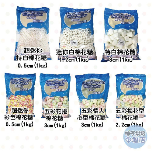 ◎超商取貨/蝦皮店到店 一單最多4包 ◎黑貓/宅配通 一單最多10包 蜜意坊棉花糖:超迷你彩色棉花糖0.5cm/迷你白棉花糖1.2cm/特白棉花糖3cm/超迷你彩色棉花糖 0.5cm/五彩情人心棉花糖3cm/花捲棉花糖3cm 品名:五彩迷你情人心棉花糖 3cm 淨重:1kg 成份:葡萄糖漿、砂糖、水、明膠(牛皮)、粘稠劑(乙醯化己二酸二澱粉)、 品質改良劑(D-山梨醇、焦磷酸鈉)、香料、著色劑(食用黃色四號、食用黃色五號、 食用紅色四十號、食用藍色一號) 1kg包裝顆數:670顆±20顆 品名:超迷你特白棉花糖 0.5cm 淨重:1kg 成份:葡萄糖漿、砂糖、水、明膠(牛皮)、粘稠劑(乙醯化己二酸二澱粉)、 品質改良劑(D-山梨醇、焦磷酸鈉)、香料、著色劑(食用黃色四號、食用黃色五號、食用紅色四十號、食用藍色一號)  1kg包裝顆數:2680顆±20顆 品名:迷你白棉花糖1.2cm 淨重:1kg 成份:葡萄糖漿、砂糖、水、明膠(牛皮)、粘稠劑(乙醯化己二酸二澱粉)、 品質改良劑(D-山梨醇、焦磷酸鈉)、香料、著色劑(食用黃色四號、食用黃色五號、食用紅色四十號、食用藍色一號)  1kg包裝顆數:2680顆±20顆 品名:特白棉花糖3cm 淨重:1kg 成份:葡萄糖漿、砂糖、水、明膠(牛皮)、粘稠劑(乙醯化己二酸二澱粉)、 品質改良劑(D-山梨醇、焦磷酸鈉)、香料、著色劑(食用黃色四號、食用黃色五號、食用紅色四十號、食用藍色一號)  1kg包裝顆數:185顆±20顆 品名:超迷你彩色棉花糖 0.5cm 淨重:1kg 成份:葡萄糖漿、砂糖、水、明膠(牛皮)、粘稠劑(乙醯化己二酸二澱粉)、 品質改良劑(D-山梨醇、焦磷酸鈉)、香料、 著色劑(食用黃色四號、食用黃色五號、食用紅色四十號、食用藍色一號) 1kg包裝顆數:2680顆±20顆 品名:花捲棉花糖3CM 淨重:1kg 成份:葡萄糖漿、砂糖、水、明膠(牛皮)、粘稠劑(乙醯化己二酸二澱粉)、品質改良劑(D-山梨醇、焦磷酸鈉)、香料、著色劑(食用黃色四號、食用黃色五號、食用紅色四十號、食用藍色一號) 產地:菲律賓 保存期限:14個月 保存方式:陰涼乾燥處,避免陽光直射處。 顆數:300顆±20顆 品名:五彩梅花型棉花糖 2.2cm 淨重:1kg 成份:葡萄糖漿、砂糖、水、明膠(牛皮)、粘稠劑(乙醯化己二酸二澱粉)、品質改良劑(D-山梨醇、焦磷酸鈉)、香料、著色劑(食用黃色四號、食用黃色五號、食用紅色四十號、食用藍色一號) 產地:菲律賓 保存期限:14個月 保存方式:陰涼乾燥處,避免陽光直射處。 顆數:680顆±20顆 ===================================================== 保存期限:14個月 保存方式:陰涼乾燥處,避免陽光直射處。 產地:菲律賓 明膠產地:澳洲 注意事項: 棉花糖表面可能有少許澱粉結塊為正常現象,請安心食用。棉花糖上可能有微小黑點,乃為焦化的糖,敬請安心食用。 棉花糖會隨存放時間增加,使糖體內空氣遞減,體積及重量縮小。 ======下單貼心提醒====== 📦 包裹規格限制: ◆下單後若商品無缺貨1~3天內會出貨。(除特殊情況除外喔~) ◆超商取貨及蝦皮店到店限重五公斤以內(含包裝材料)。 提醒您若購買1公斤的商品,超取蝦取最多只能購買四包喔! ◆7-11便利店,全家冷凍,蝦皮店到家宅配_重量限制8公斤以內 ◆蝦皮黑貓,蝦皮宅配通_重量限制18公斤以內 ◆賣家宅配常溫_重量限制25公斤內,冷藏宅配,冷凍宅配_重量限制20公斤以內(含包材) ◆花東,外島及偏遠地區 運費另計, 下單需另外下標「運費補差額」 ◆如遇夏季氣溫較高,建議巧克力及堅果類商品以「低溫宅配」方式配送。 若選擇超商.店到店等常溫配送造成巧克力融化,無法提供更換或退費服務。 ◆開箱貨品時請錄影,有任何問題可以確保雙方權益!!!! ◆低溫商品、易於腐敗、保存期限較短之商品,不適用《消費者保護法》第19條的七天鑑賞期。出貨後將不受理退換貨。 🔊因庫存不會即時更新,若有急用~歡迎聊聊詢問庫存狀態哦! 🔊任何問題歡迎 "聊聊詢問小編喔" ◆實體店面: ◆柚子烘焙食品-中壢店 地址:桃園市中壢區延平路448號1樓 電話:03-4255030 ◆柚子烘焙食品-春日店 地址:桃園市桃園區春日路1156號 電話:03-3261910 ◆柚子烘焙食品-中清店 地址:台中市北區中清路一段292號 電話:04-22061810 ◆柚子烘焙食品-永春店 地址:台中市南屯區永春東路800號 電話:04-23825489 ◆柚子烘焙食品-逢甲店 地址:台中市西屯區逢甲路138號 電話:04-24520684 ◆營業時間:週一至週日 10:00-21:00