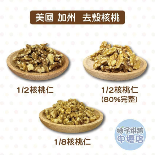 ◎堅果類商品建議採用低溫配送品質最佳,若選擇常溫運送導致商品有受熱變質狀況,則不受理退貨退款哦。 美國加州生核桃 養生堅果 生核桃 1/2大小佔40%,其他60%是綜合的大小(40%完整) 1/2大小佔80%,其他20%是綜合的大小(80%完整) 品名一:美國 1/2核桃(40%完整) 品名二:美國 1/2核桃(80%完整) 成份:美國加州去殼核桃 規格:450公克 產地:美國. 保存期限:24個月 保存方式:請儲存於冷藏處(2~7°C) 過敏原:本產品含有堅果 *請注意核桃可能含有果殼屑片,使用前請先篩選。 品名三:美國 1/8核桃仁 成份:核桃 規格:450公克 產地:美國. 保存期限:36個月 保存方式:請儲存於冷藏處(2~7°C) 過敏原:本產品含有堅果 *請注意核桃可能含有果殼屑片,使用前請先篩選。 ======下單貼心提醒====== 📦 包裹規格限制: ◆下單後若商品無缺貨1~3天內會出貨。(除特殊情況除外喔~) ◆超商取貨及蝦皮店到店限重五公斤以內(含包裝材料)。 提醒您若購買1公斤的商品,超取蝦取最多只能購買四包喔! ◆7-11便利店,全家冷凍,蝦皮店到家宅配_重量限制8公斤以內 ◆蝦皮黑貓,蝦皮宅配通_重量限制18公斤以內 ◆賣家宅配常溫_重量限制25公斤內,冷藏宅配,冷凍宅配_重量限制20公斤以內(含包材) ◆花東,外島及偏遠地區 運費另計, 下單需另外下標「運費補差額」 ◆如遇夏季氣溫較高,建議巧克力及堅果類商品以「低溫宅配」方式配送。 若選擇超商.店到店等常溫配送造成巧克力融化,無法提供更換或退費服務。 ◆開箱貨品時請錄影,有任何問題可以確保雙方權益!!!! ◆低溫商品、易於腐敗、保存期限較短之商品,不適用《消費者保護法》第19條的七天鑑賞期。出貨後將不受理退換貨。 🔊因庫存不會即時更新,若有急用~歡迎聊聊詢問庫存狀態哦! 🔊任何問題歡迎 "聊聊詢問小編喔" ◆實體店面: ◆柚子烘焙食品-中壢店 地址:桃園市中壢區延平路448號1樓 電話:03-4255030 ◆柚子烘焙食品-春日店 地址:桃園市桃園區春日路1156號 電話:03-3261910 ◆柚子烘焙食品-中清店 地址:台中市北區中清路一段292號 電話:04-22061810 ◆柚子烘焙食品-永春店 地址:台中市南屯區永春東路800號 電話:04-23825489 ◆柚子烘焙食品-逢甲店 地址:台中市西屯區逢甲路138號 電話:04-24520684 ◆營業時間:週一至週日 10:00-21:00