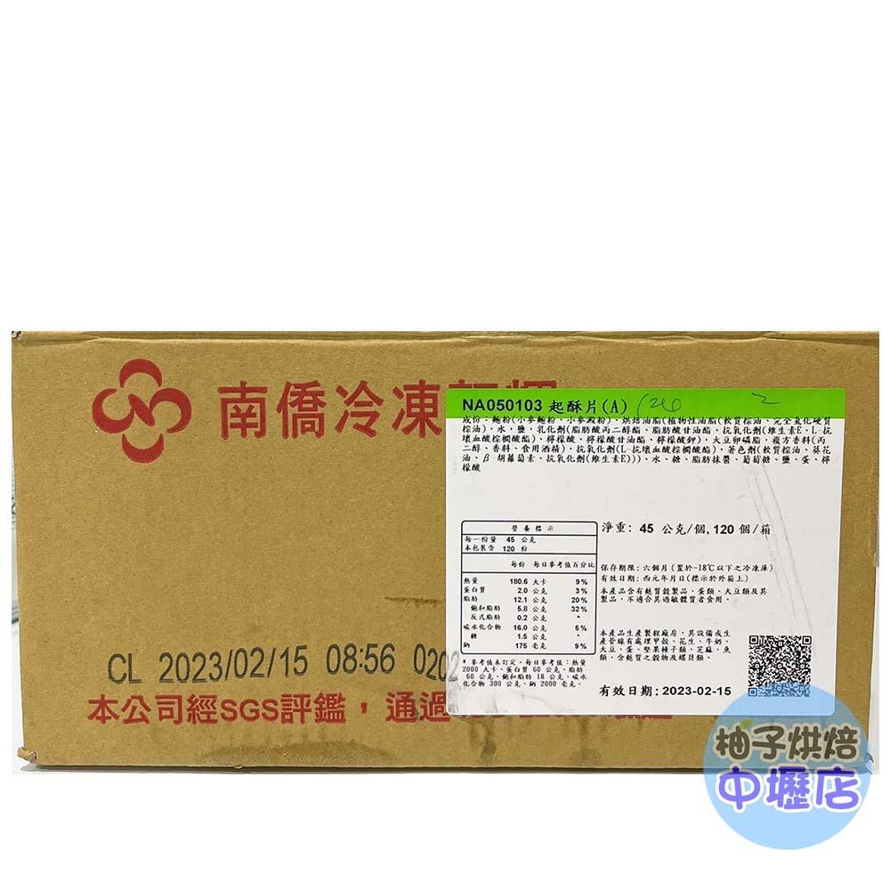 冷凍 起酥片 品名:南僑起酥片(A) 產地:台灣 規格:45公克/個 120個/箱 成分:麵粉,烘焙油脂,水,鹽,乳化劑,大豆卵磷脂,(脂肪酸丙二醇脂,脂肪酸甘油脂,抗氧化劑),複方香料(丙二醇脂,香料,食用酒精),抗氧化劑,著色劑,水,糖,葡萄糖,鹽,蛋,檸檬酸 本產品含有麩質穀製品,蛋,大豆類及其製品 保存方式:冷凍6個月 製造商:南僑油脂事業股份有限公司 *****下單請注意***** 📦 包裹規格限制: ◆超商取貨及蝦皮店到店限重五公斤以內(含包材)。 提醒您若購買1公斤的商品,超取蝦取最多只能購買四包喔! ◆下單後若商品無缺貨1~3天內會出貨。(特殊情況除外) ◆賣家宅配常溫_重量限制25公斤內,冷藏宅配,冷凍宅配_重量限制20公斤以內(含包材)~ ◆花東,外島及偏遠地區 運費另計, 下單需另外下標「運費補差額」 ◆開箱貨品時請錄影,有任何問題可以確保雙方權益!!!! ◆低溫商品、易於腐敗、保存期限較短之商品,不適用《消費者保護法》第19條的七天鑑賞期。出貨後將不受理退換貨。 🔔 任何問題歡迎 "聊聊" ◆實體店面: ◆柚子烘焙-中壢店 地址:桃園市中壢區延平路448號1樓 電話:03-4255030 ◆柚子烘焙-逢甲店 地址:台中市西屯區逢甲路138號 電話:04-24520684 ◆柚子烘焙-中清店 地址:台中市北區中清路一段292號 電話:04-22061810 ◆柚子烘焙-永春店 地址:台中市南屯區永春東路800號 電話:04-23825489 ◆營業時間:週一至週日 10:00-21:00