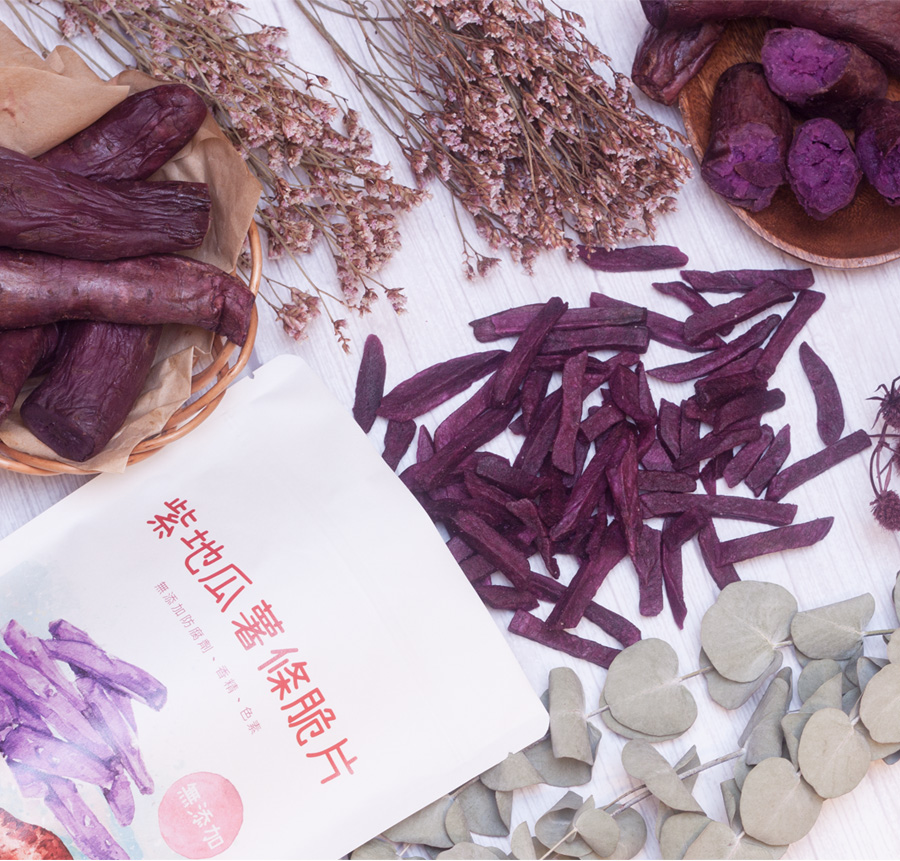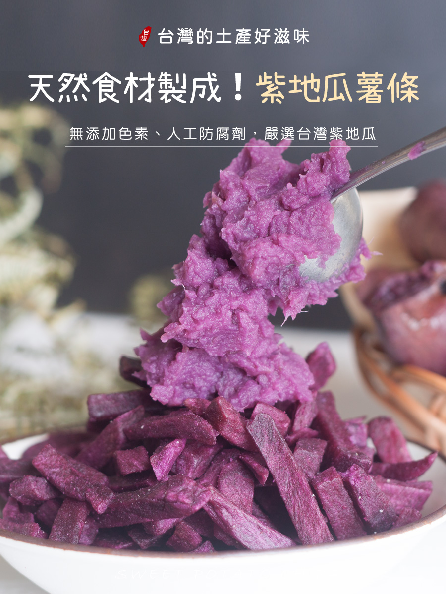 紫地瓜薯條原料來自台灣土產,地瓜成分單純,無額外添加色素及防腐劑,平日解饞的好零食,不用怕麻煩像吃地瓜需要剝皮還弄髒了手,吃不完直接可以用夾鏈袋保存即可。