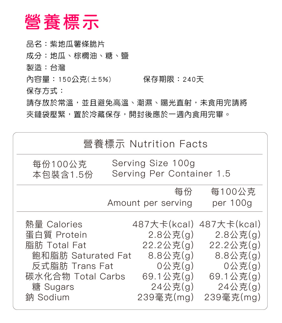 ◆成 份: 紫地瓜、棕櫚油、糖、鹽