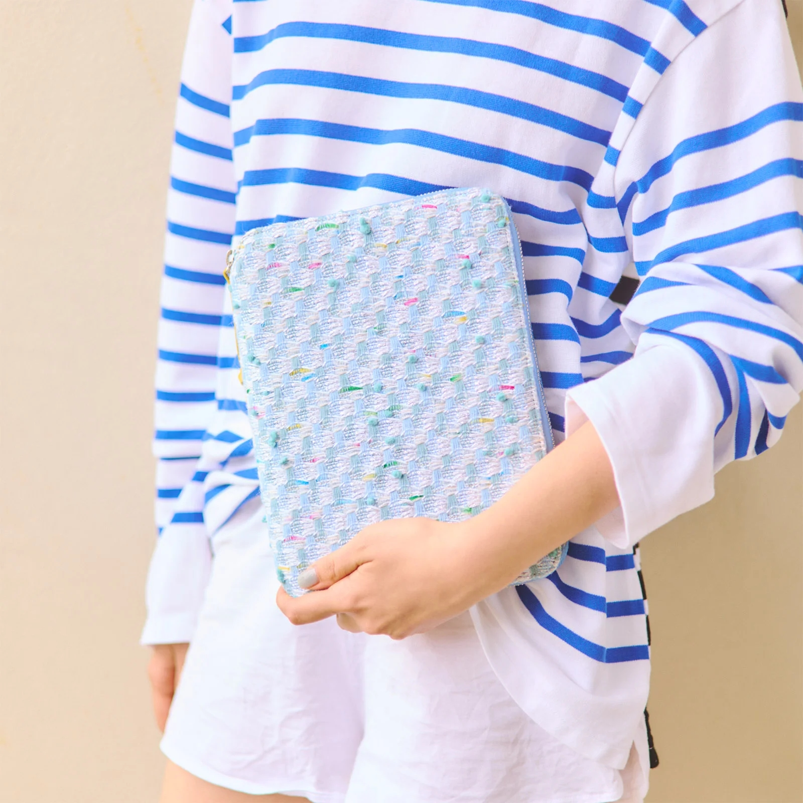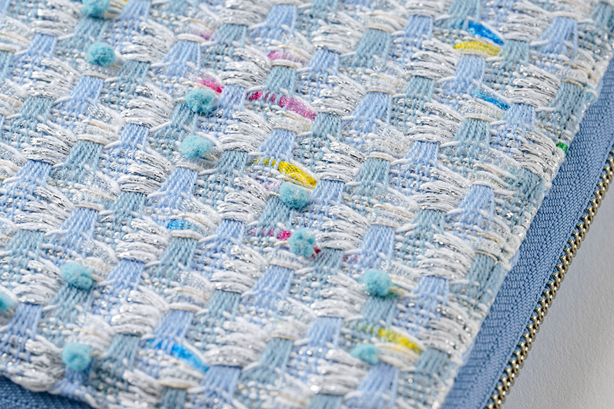 藍色、白色和銀色的紗線交錯編織,就像暑假的艷陽下,閃爍著陽光的大海。不時在其中顯現的紅色、綠色、藍色和黃色的紗線,