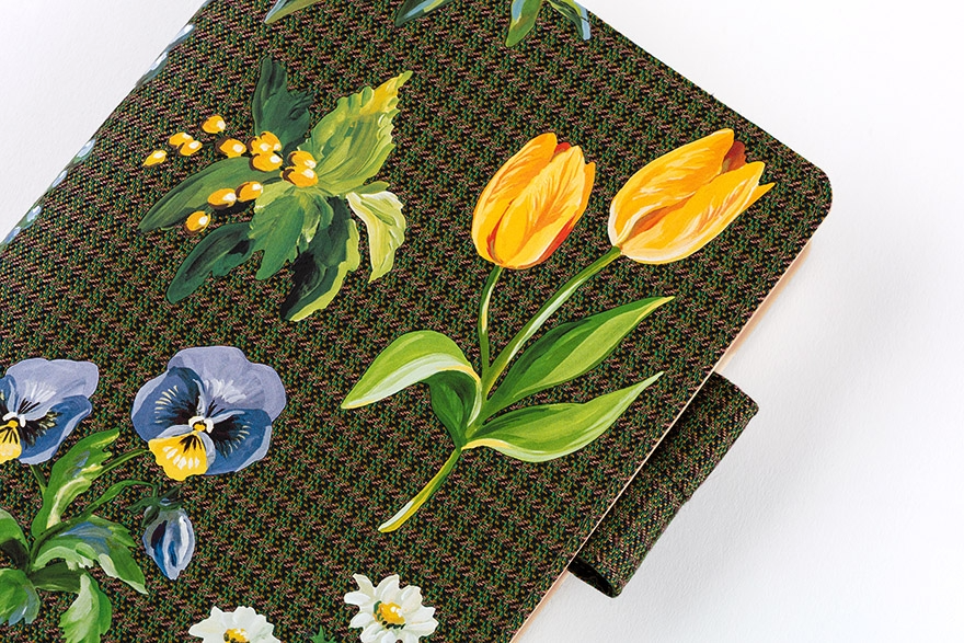 上面點綴著彷彿以筆觸直接描繪般的鮮明花卉圖案,