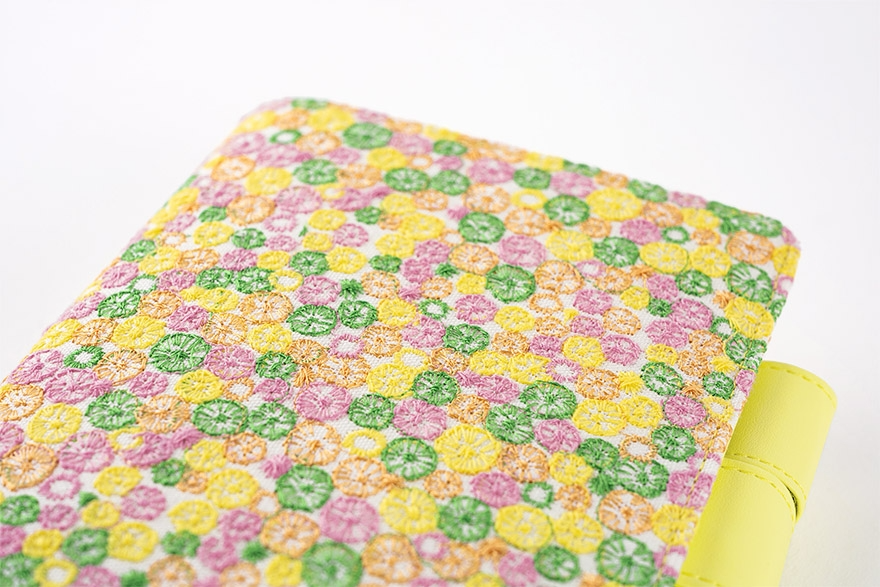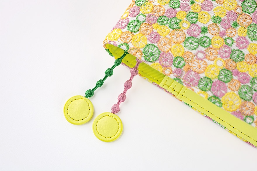 將色彩繽紛的圓點刺繡在布料上,呈現出明亮而吸睛的設計。