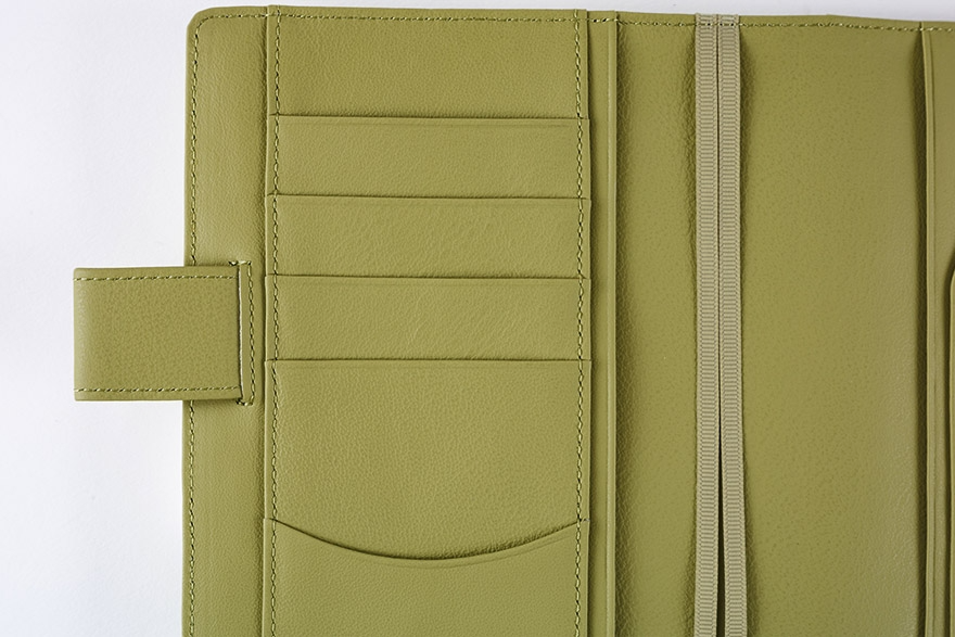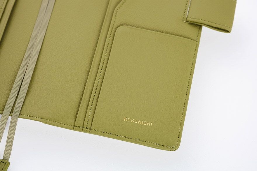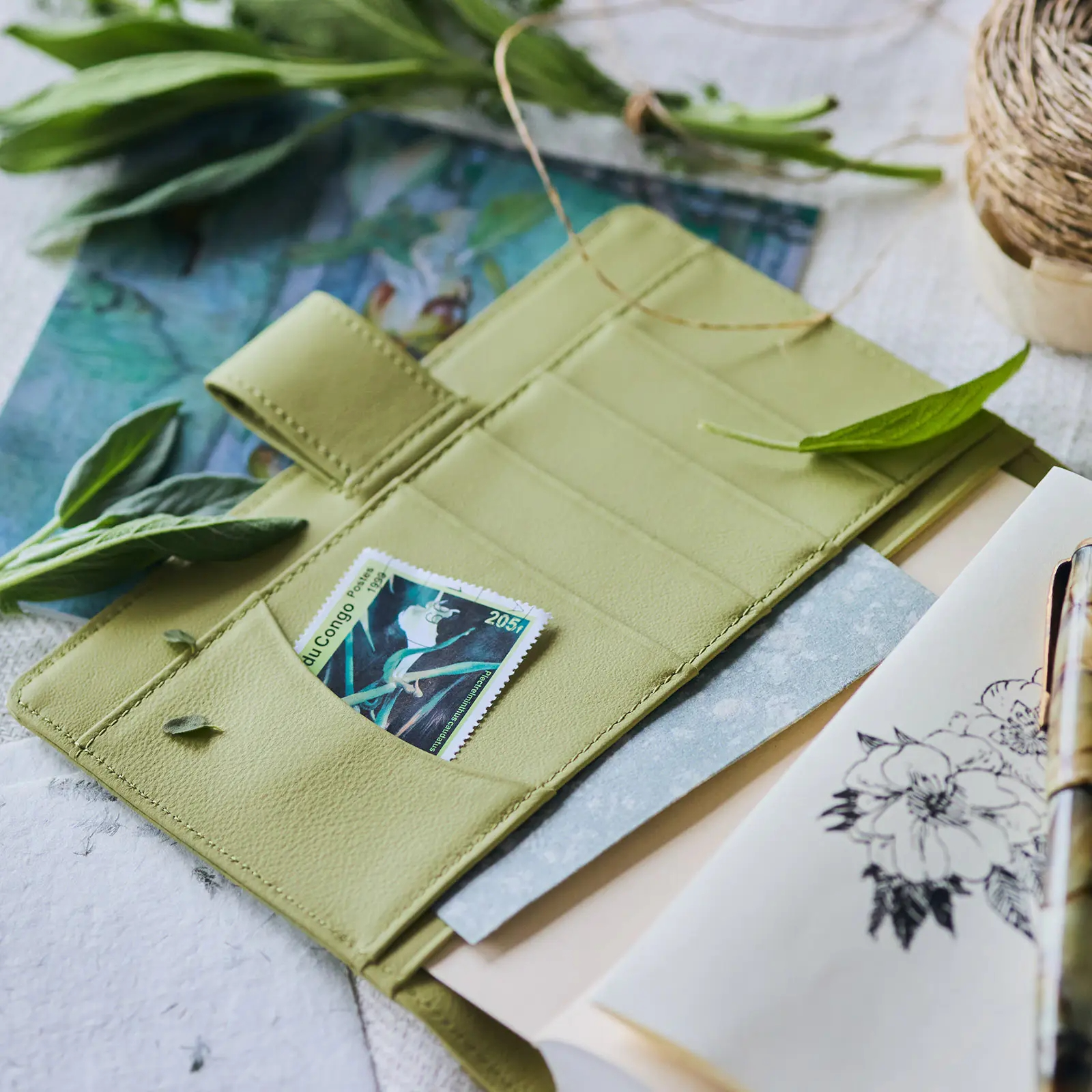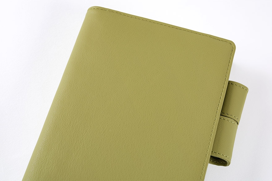 這款手帳書衣,選用帶有 鼠尾草般淡綠色調的皮革。