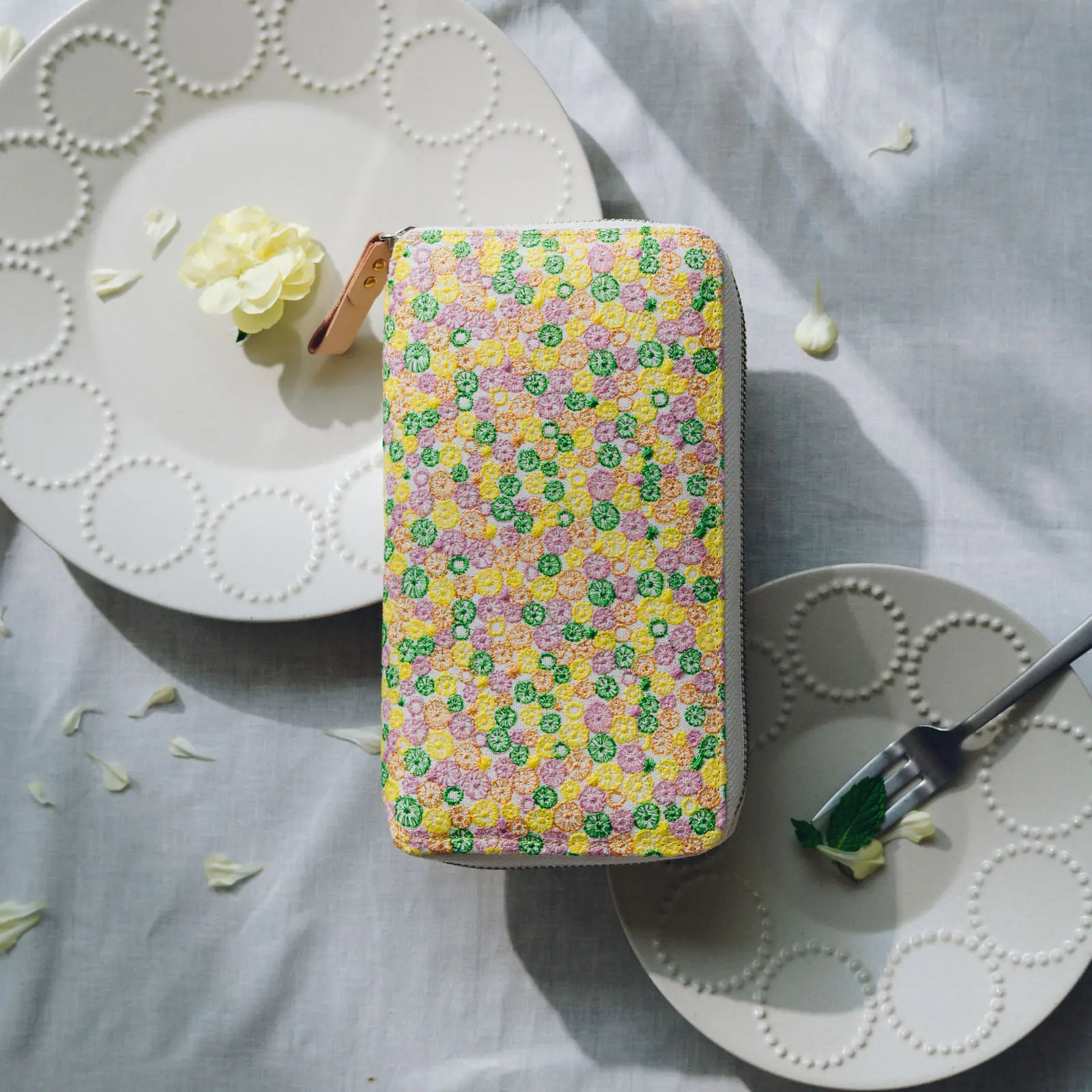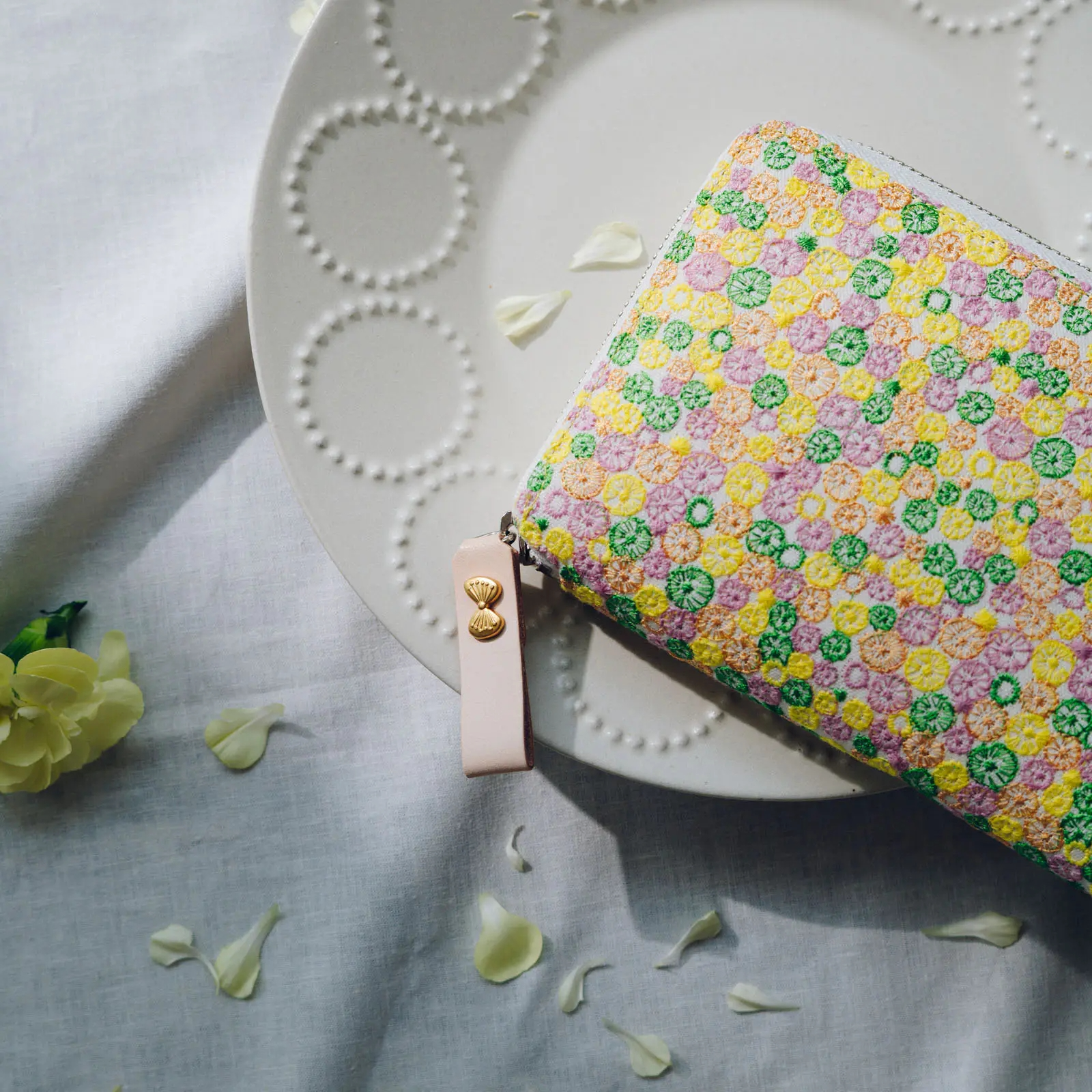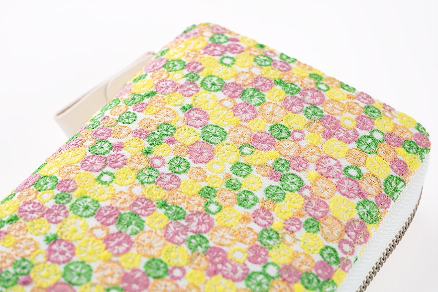 將色彩繽紛的圓點刺繡在布料上,呈現出明亮而吸睛的設計。