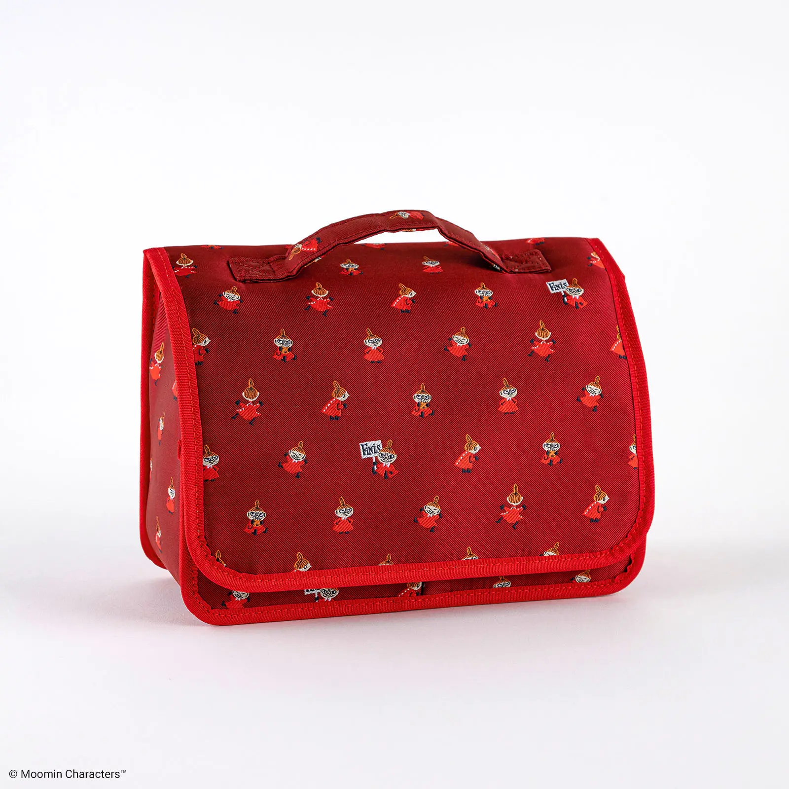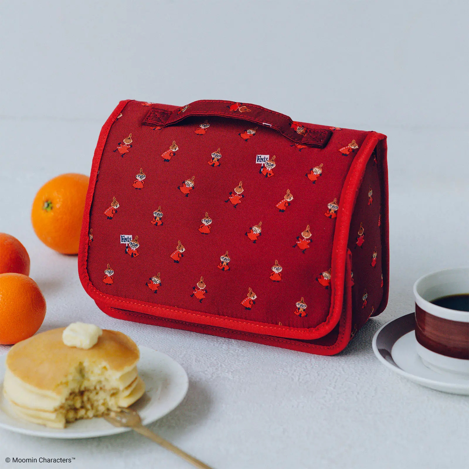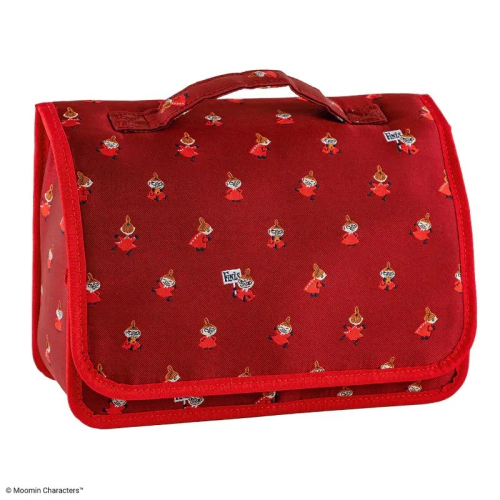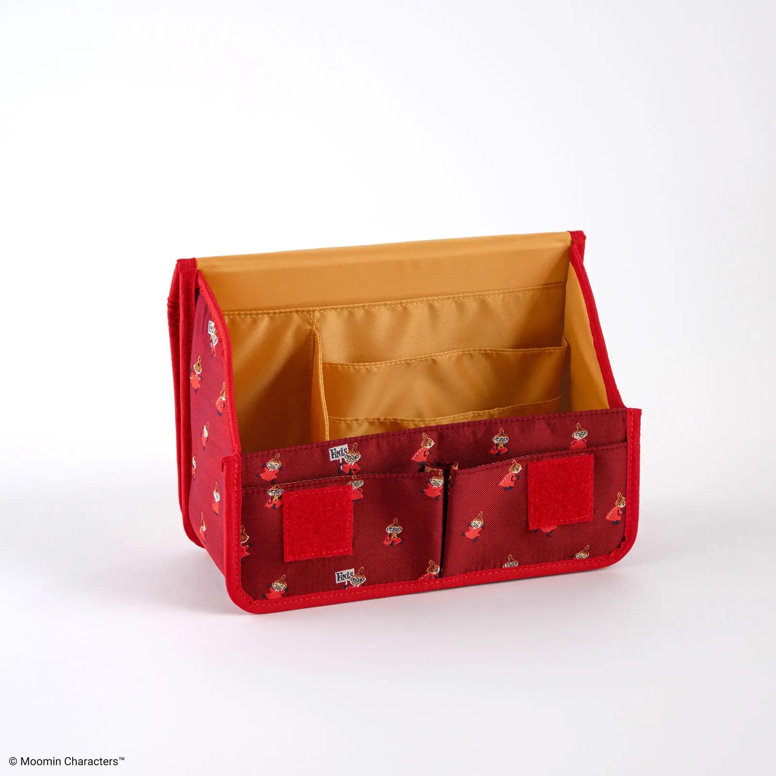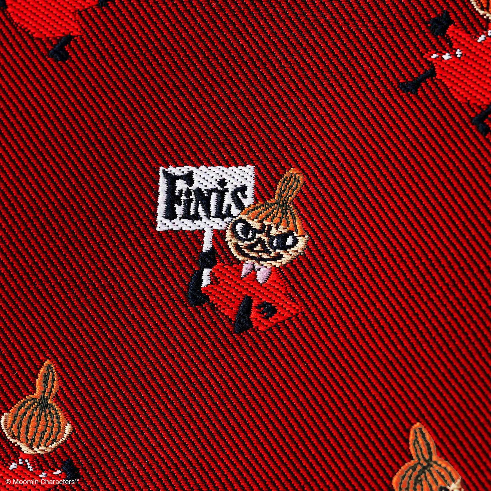 底色是沉穩的紅色,上面布滿 小美(Little My) 的各種表情與姿態:大笑、生氣、吃水果……栩栩如生。