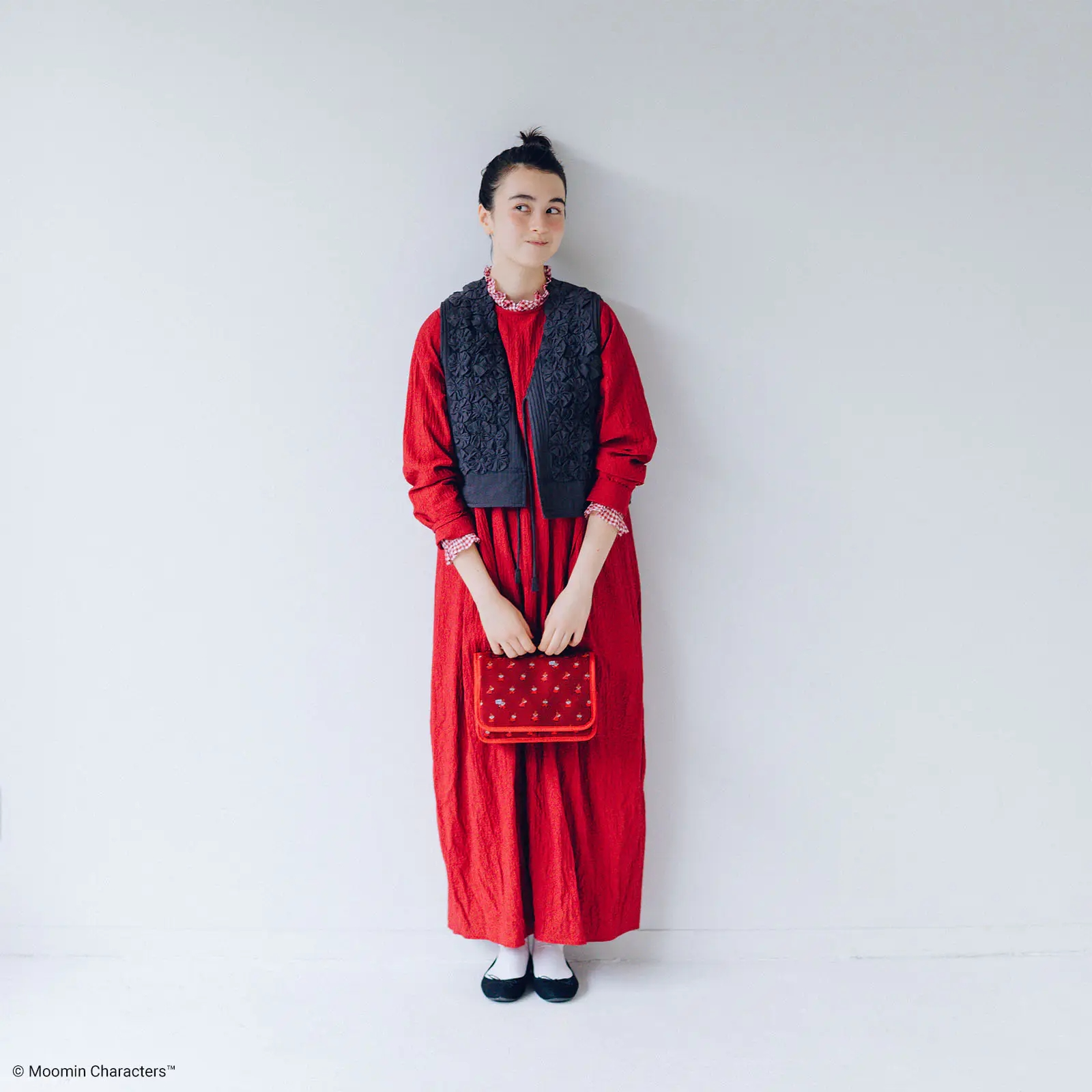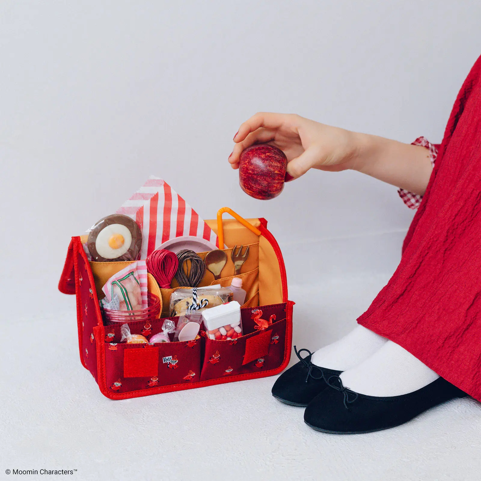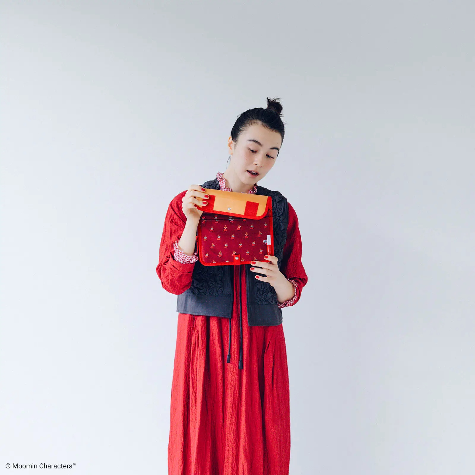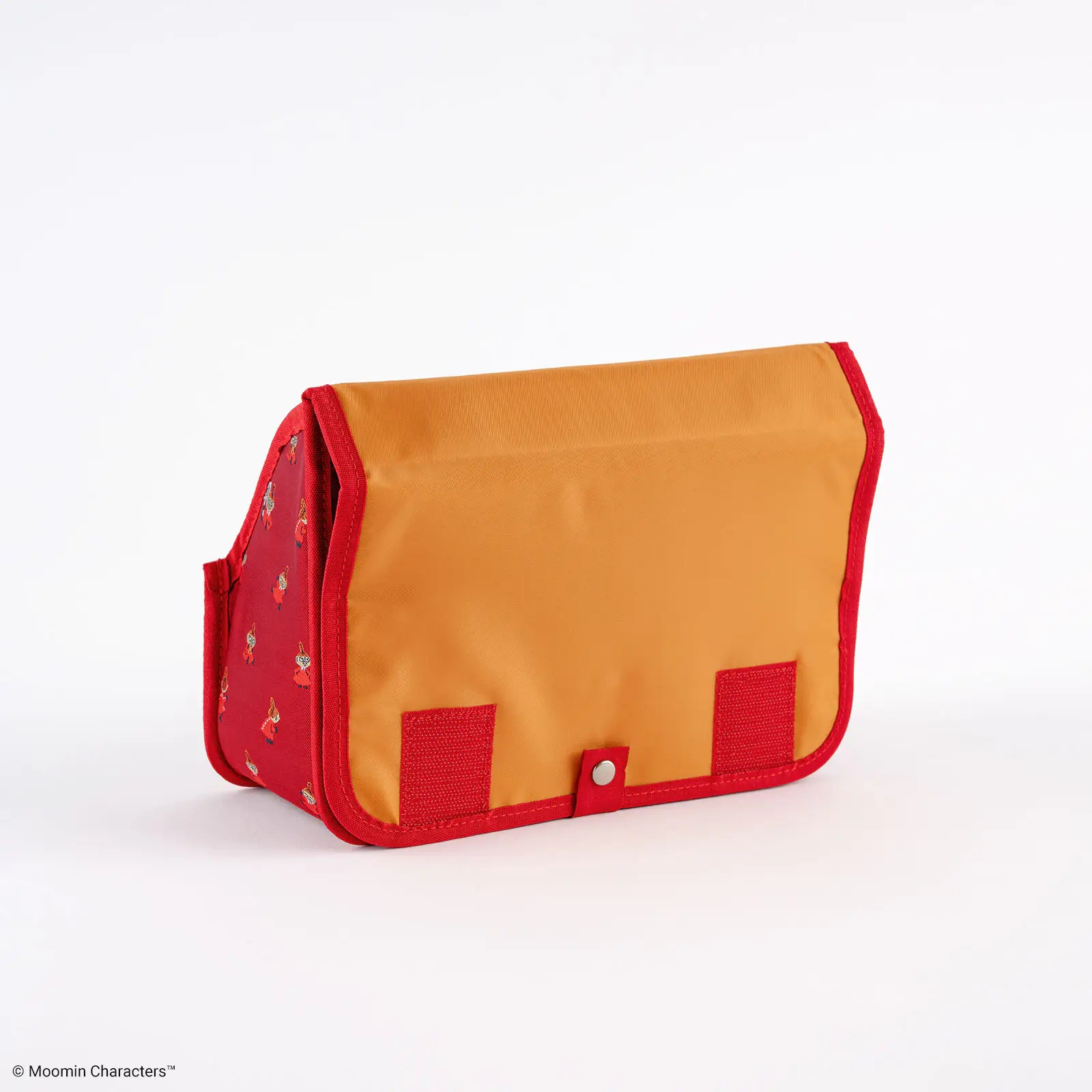 底色是沉穩的紅色,上面布滿 小美(Little My) 的各種表情與姿態:大笑、生氣、吃水果……栩栩如生。