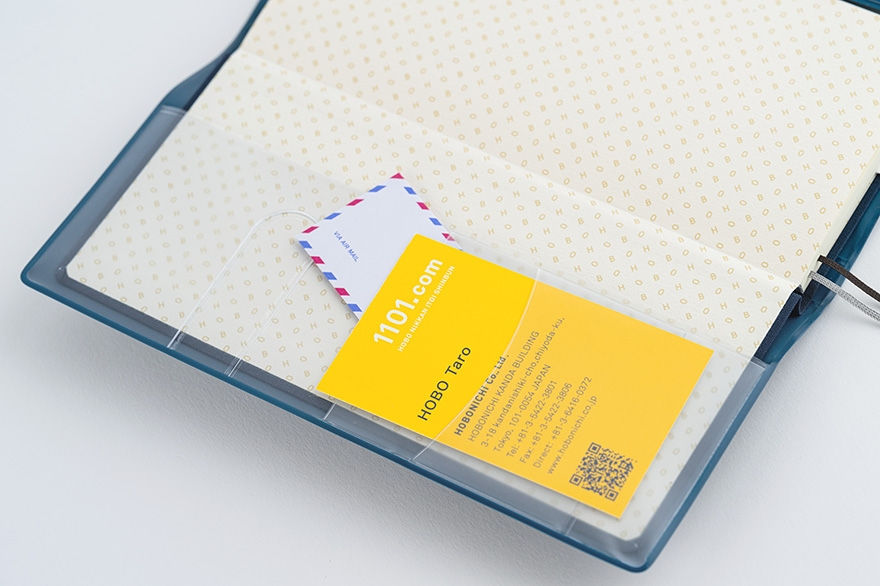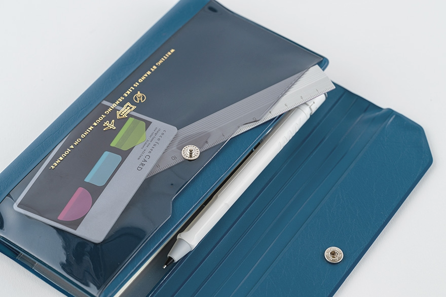 • 內頁左側設有 透明卡片夾層,可收納名片或小卡;上方翻蓋可作 書籤 使用。