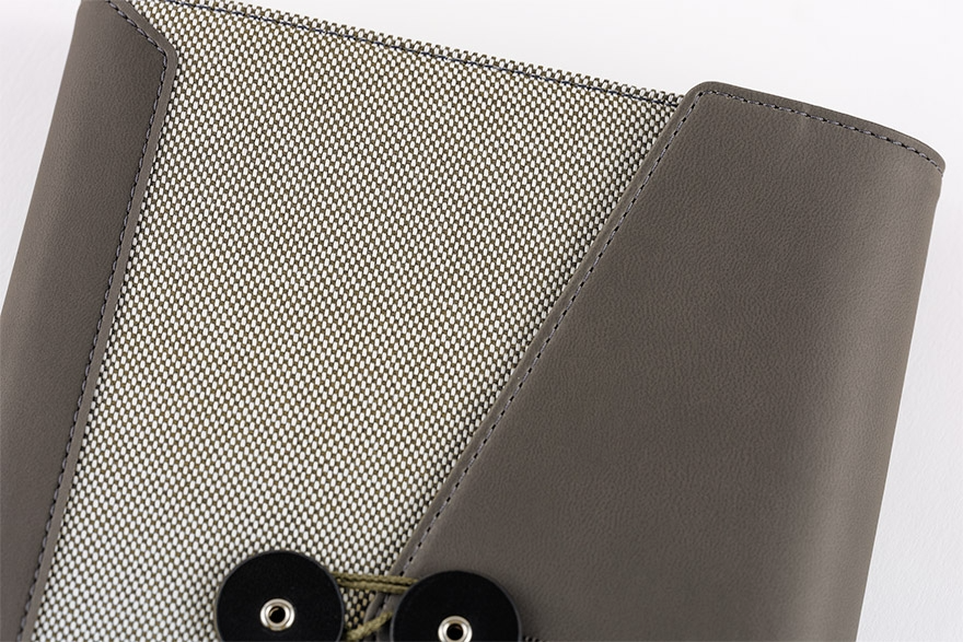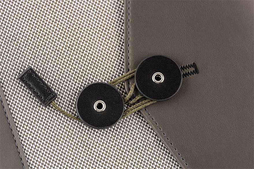 📫紐扣上的圓形零件與紐繩末端皆使用真皮製成。
