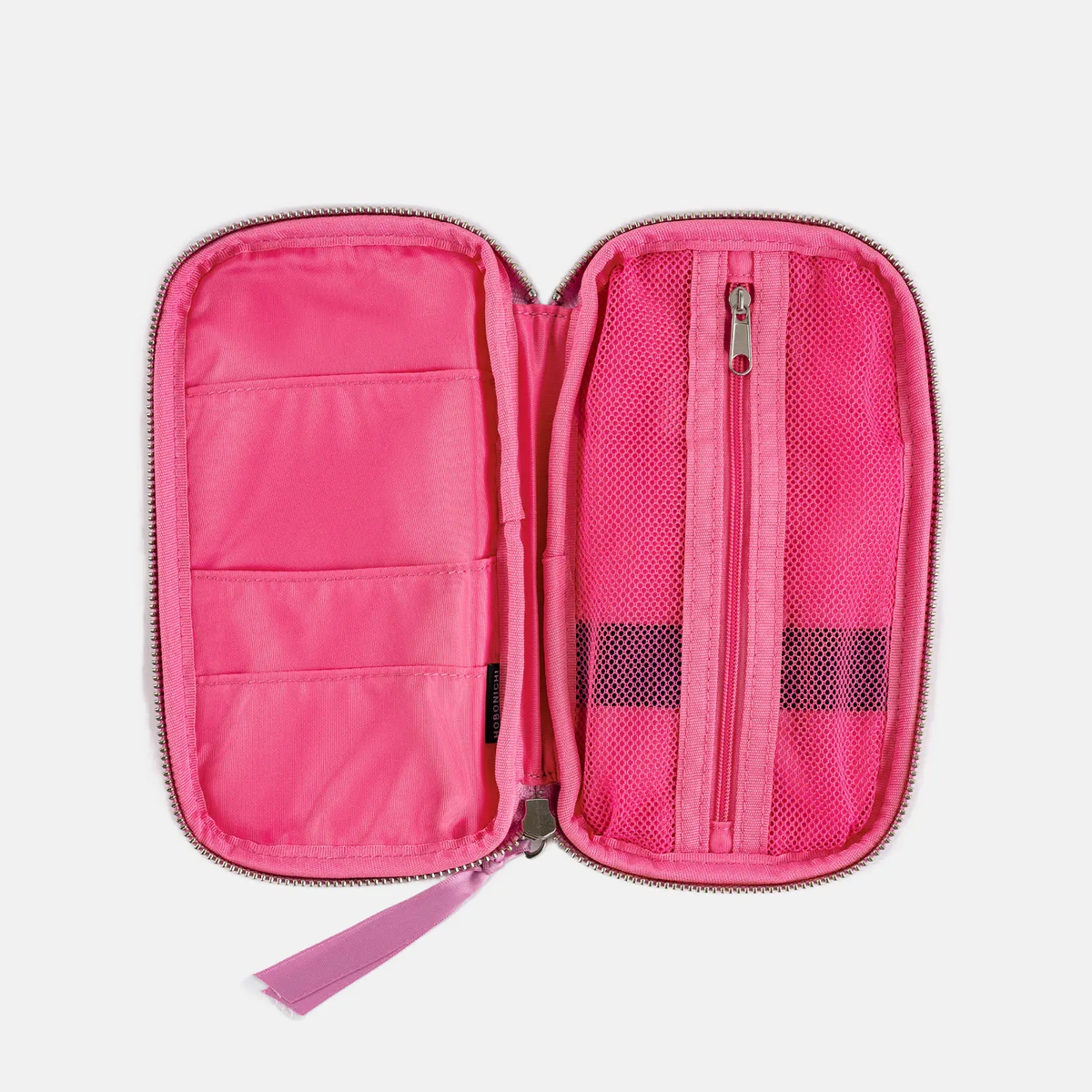 包包的立體摺邊與拉鍊頭皆採用粉紅色作為亮點,