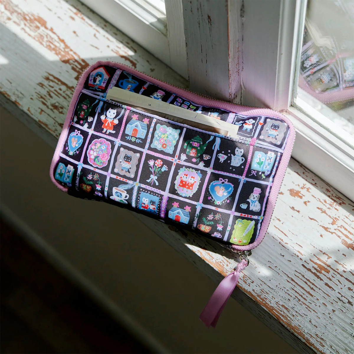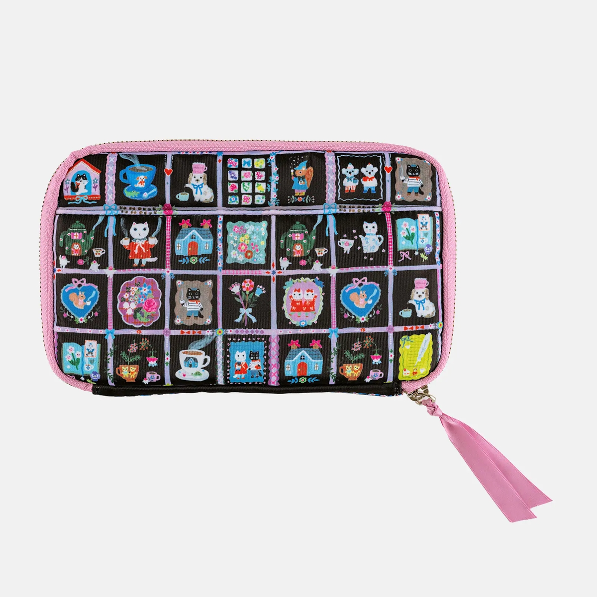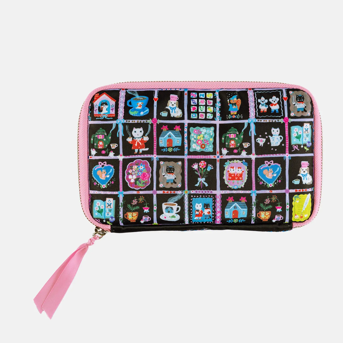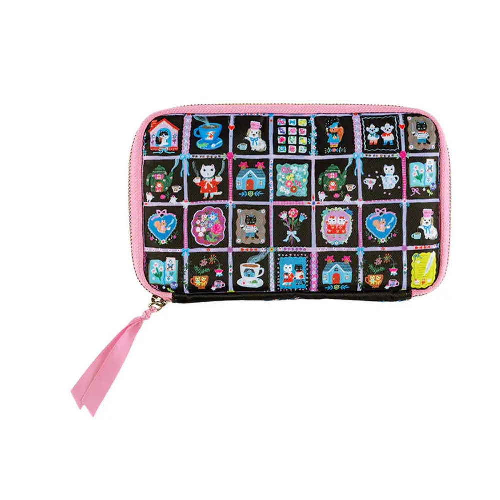 黑色底布上點綴繽紛插圖,摺邊與拉鍊頭的粉嫩色調成為俏皮亮點,