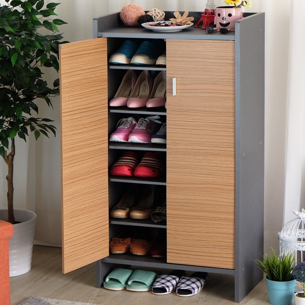 高台設計可擺放各式小物也可收納鞋子,左右都有板子立起不怕掉落;獨特底層墊高設計,有防潮又可增加收納空間。此款鞋櫃附有活動板可以依照鞋子款式做調整,可收納室內拖鞋、外出輕便鞋等等。鞋櫃不只當鞋櫃使用,也可以擺放在任何空間使用,例如:書房、臥房、客廳等等。跳脫於傳統顏色搭配,此款使用雙色混搭:經典木紋門板加上全新布紋質感,在新舊的調和下,讓居家空間有全新的風采。約可收納21雙鞋。