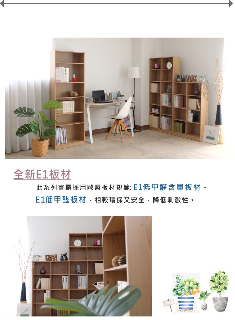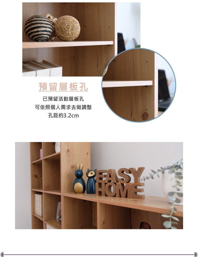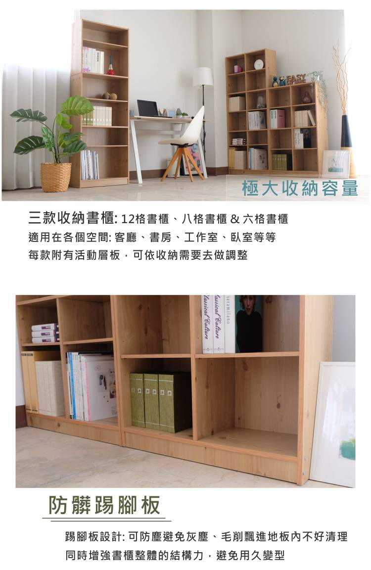 此款實心8格可調式書櫃,簡單大方的風格,採用12格式開放設計,收納能力強!不論是為收藏愛書、擺設器皿、隔間櫃使用,都可以隨時發揮創意,不受環境的限制使用,適合各種居家環境。此產品採用實心板材精製而成,而非一般市售的空心板材,耐用度及穩固性大大提升。此款採用歐盟標規E1低甲醛實芯板材,較低刺激性環保又安全。內附活動隔板x4,可以自由調整所需高度!應用面廣,可拿來當書櫃/展示櫃/隔間櫃...等,一櫃可當多櫃使用,保證是最超值的商品。使用全新裝潢流行顏色:北歐原木風,不限室內風格和顏色都能夠輕鬆隨意搭配,輕輕鬆鬆讓自己沉浸在與書本的時光。