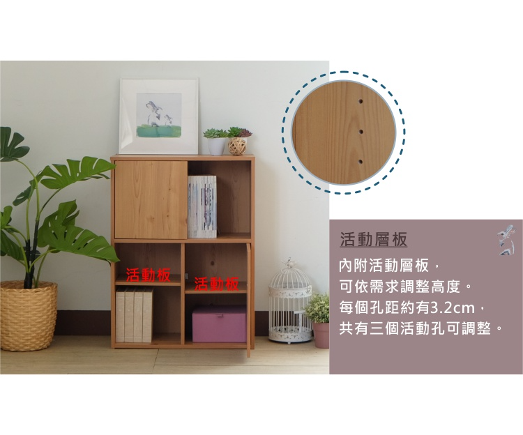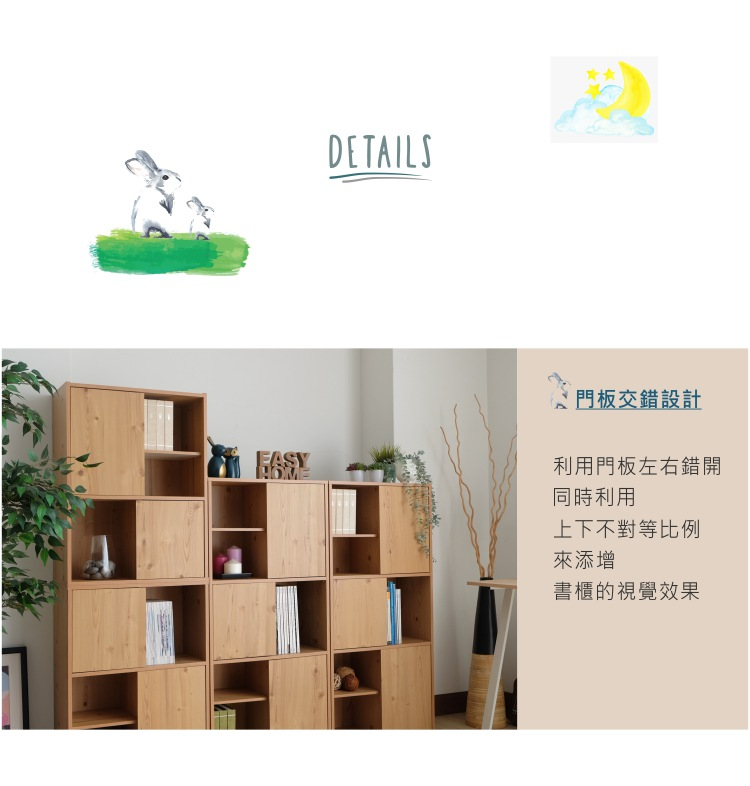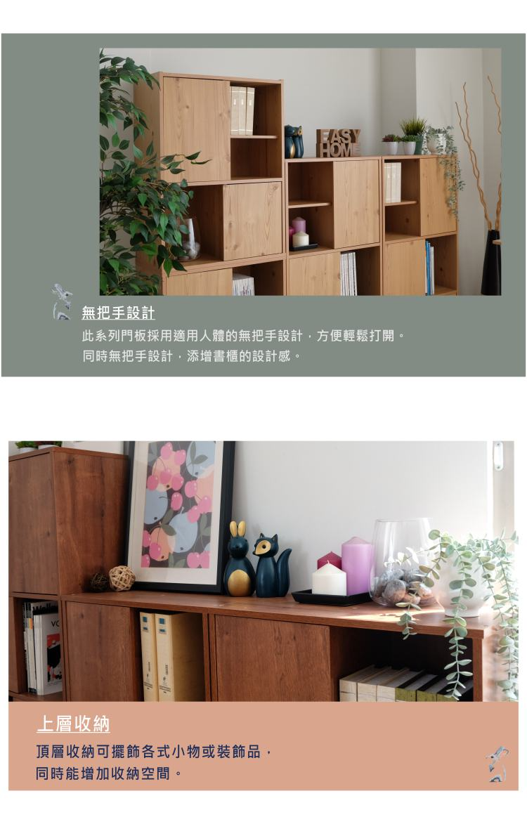 此款雙門四格收納書櫃,不同於一般正四方大小的格子去做設計,我們利用上下不對等比例及門板左右錯開來添增書櫃的視覺效果及設計感。此系列門板採用適用人體的無把手設計,方便輕鬆開門。頂層收納可擺飾各式小物或裝飾品,同時能增加收納空間及添增屋內的柔和氣氛。內附活動層板,可依需求調整高度,共有三個活動孔可調整。此書櫃內附兩個連結木栓,可上下堆疊使用,並同時節省佔用地面的空間。可放置在書房、兒童房、玄關、客廳、臥房等地方都相當合適。使用全新裝潢流行顏色,不限室內風格和顏色都能夠輕鬆隨意搭配。