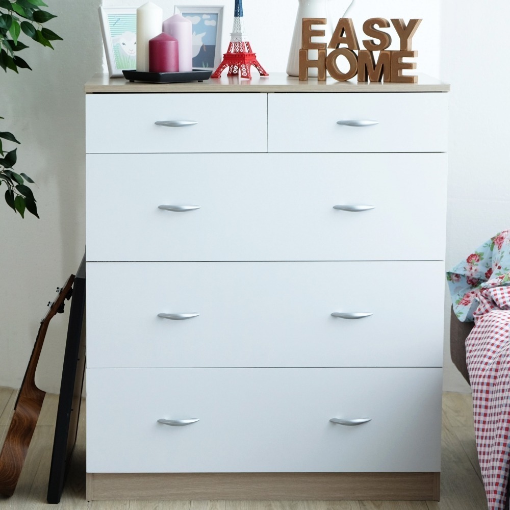 《舒室》2.6尺二小三大抽斗櫃~秋香+白色。採用高級塑合板製作,再加上補強板、抽屜補強板和全層雙抽頭,讓抽屜整體結構更穩固。不同於一般市面上的塑膠或鐵製滑軌,我們採用滾珠滑軌加強抽屜的耐用度!整體造型簡潔俐落,再搭配時尚手把讓斗櫃質感增加許多。二小三大抽收納大容量設計,能將零散的物品、文件或是衣物,整齊規劃,輕鬆收納!上方還能放置擺飾品,增加房間的柔和氣氛!可放置在玄關、客廳、臥房等地方都相當合適。使用全新裝潢流行顏色:秋香混搭白色,不限室內風格和顏色都能夠輕鬆隨意搭配。