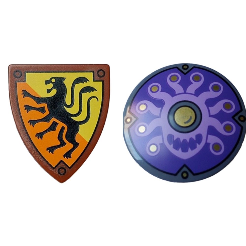 2,盾牌圓形/圓形凸面,中型薰衣草怪物,有 10 個觸手,金色眼睛和鉚釘,大眼睛黑色輪廓,深紫色背景圖案上有新月(旁觀者)