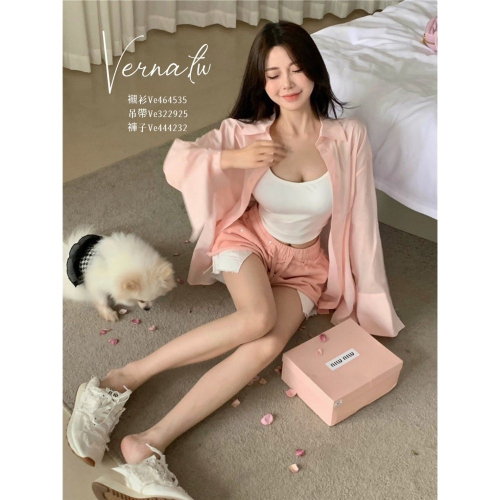 粉嫩薄款襯衫+吊帶背心+粉褲