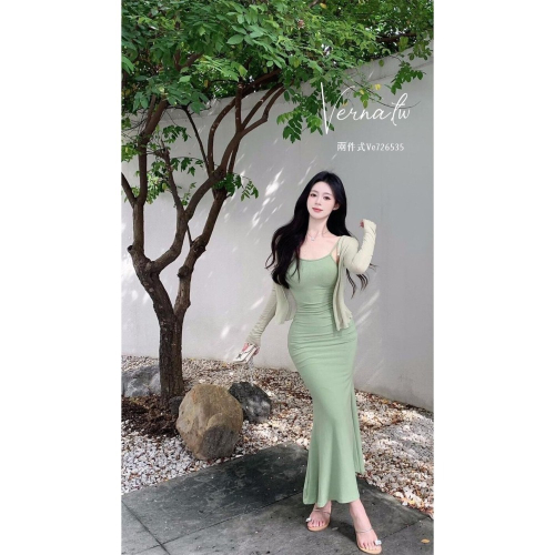 牛油果奶綠開衫+魚尾連身裙