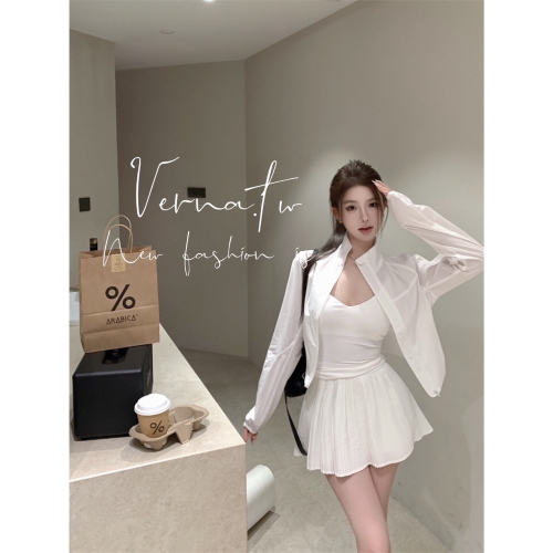 微透感寬鬆開衫+背心+百摺短裙