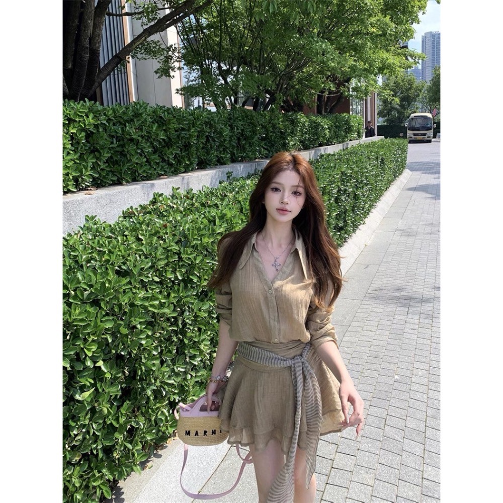 夏日氛圍‘ 飄逸襯衫x短裙x絲巾腰帶三件套