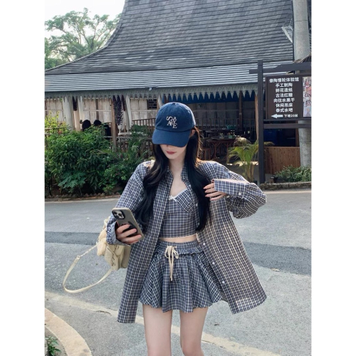 甜辣假期 三件套裝 復古格子襯衫x背心x短裙