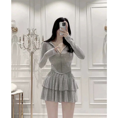 休閒可愛 連帽拉鍊外套x蛋糕裙套裝
