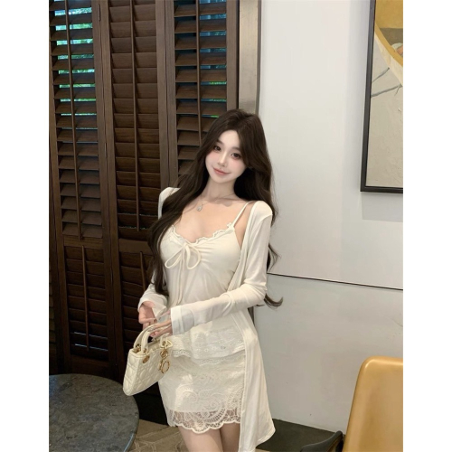 柔欲白開水 花邊吊帶背心x蕾絲裙x外套 白色女神三件套裝