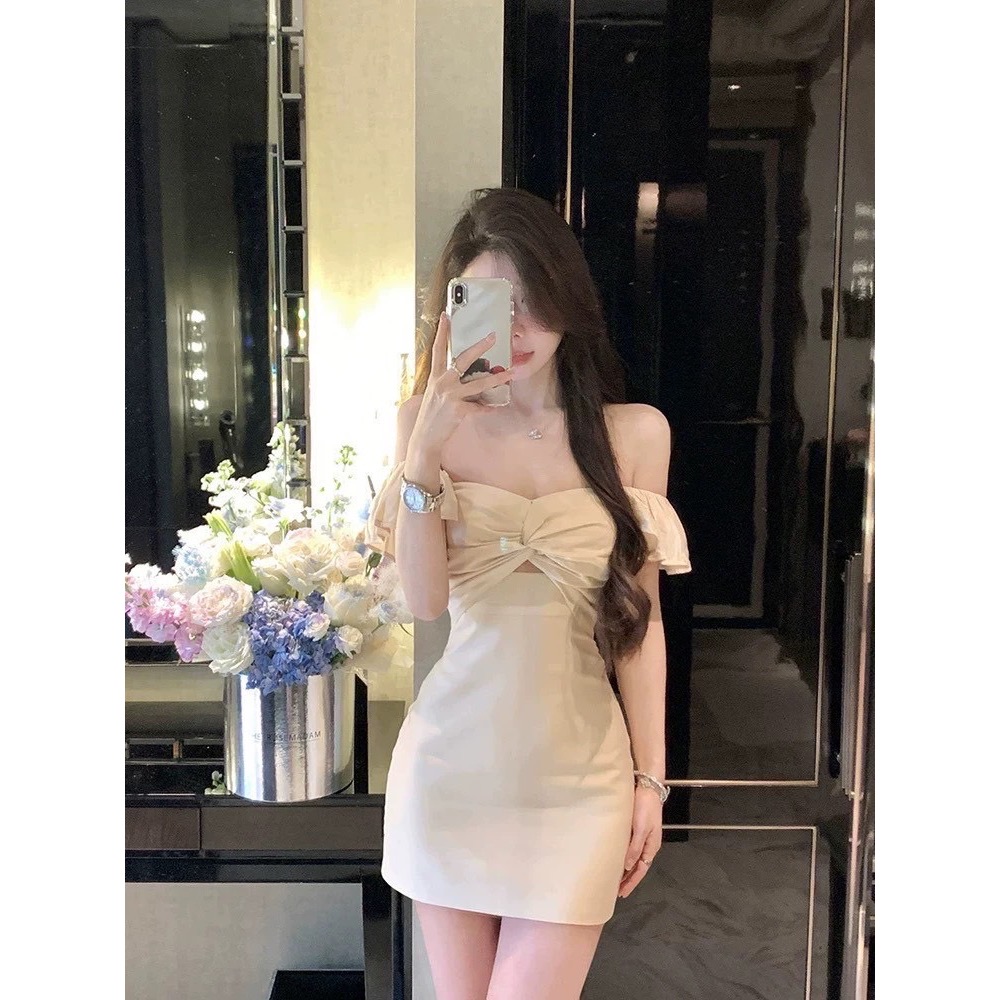 約會戰袍 扭結鏤空露肩奶杏連身裙