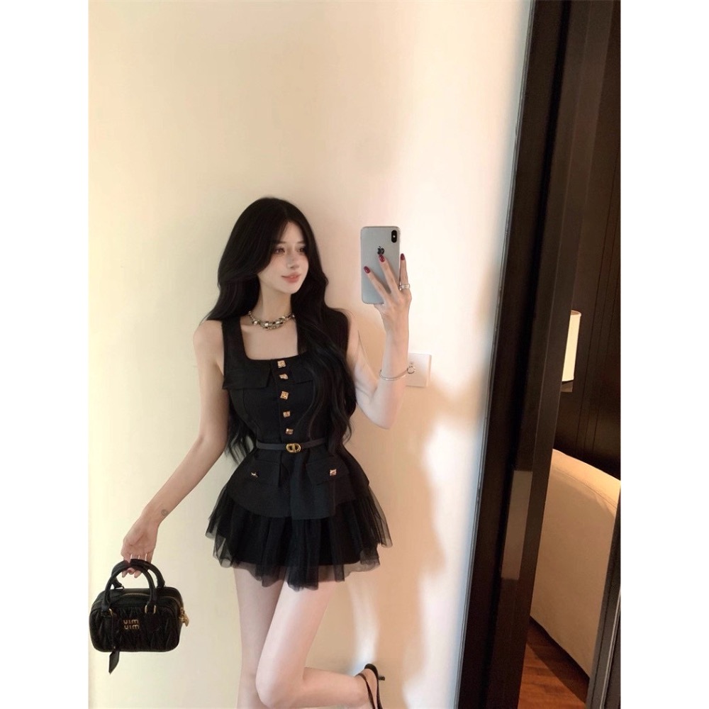 設計感黑色無袖x紗裙兩件套裝