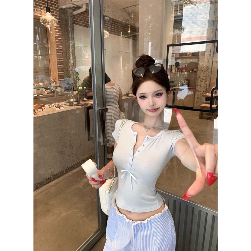 蝴蝶結藍短上衣x木耳邊條紋藍長褲