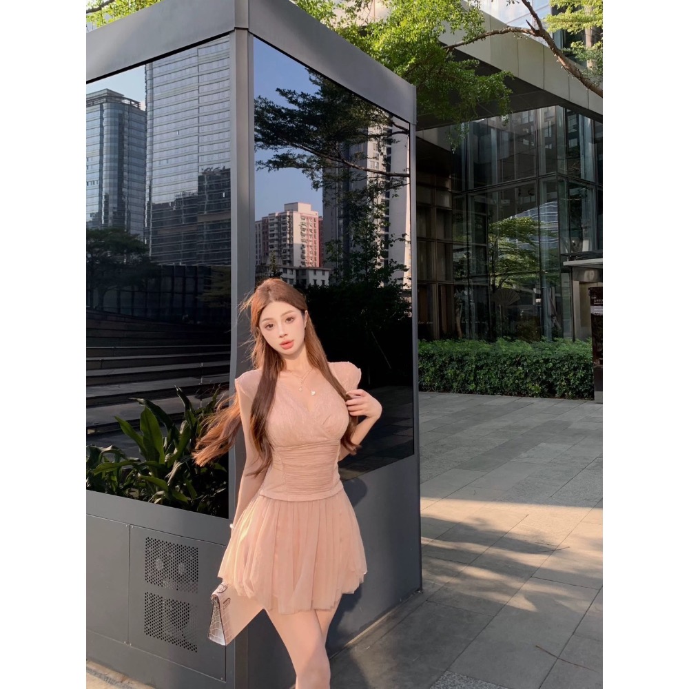 芭蕾如夢胭粉V領蕾絲背心x網紗短裙
